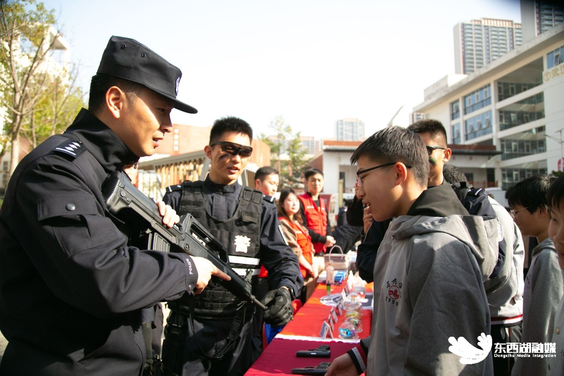 上午9点半,活动在该校交响乐队演奏的《歌唱祖国》中开场。随后,民警和师生同台演出,用原创歌曲、情景小品、脱口秀、有奖问答等形式进行宣讲和互动,现场气氛热烈。“网红”民警胡志红从网上走进现场,为师生剖析典型电诈骗局,提醒大家护好“钱袋子”;禁毒支队民警卞如薇现场向同学们宣讲毒品的危害;交管支队高航、胡诗琪等民警用情景剧形式,诠释交通安全的重要性;武汉市人民警察培训学院教官应红杰带来的山东快书《抓到一个假警察》,引得台下爆笑连连;特警支队猛士突击队8名特警队员全副武装登台进行枪操表演,上端枪、跪姿持枪、仰卧持枪……一个个连续的战术动作下来,台下响起了阵阵掌声。