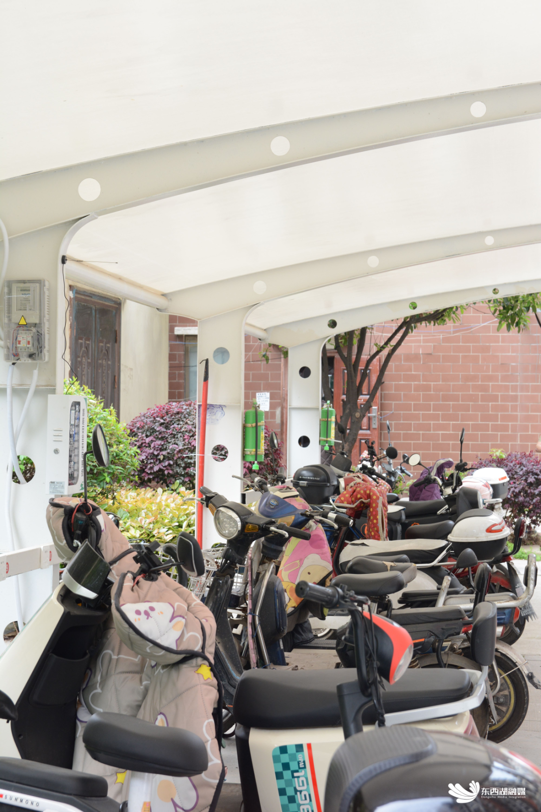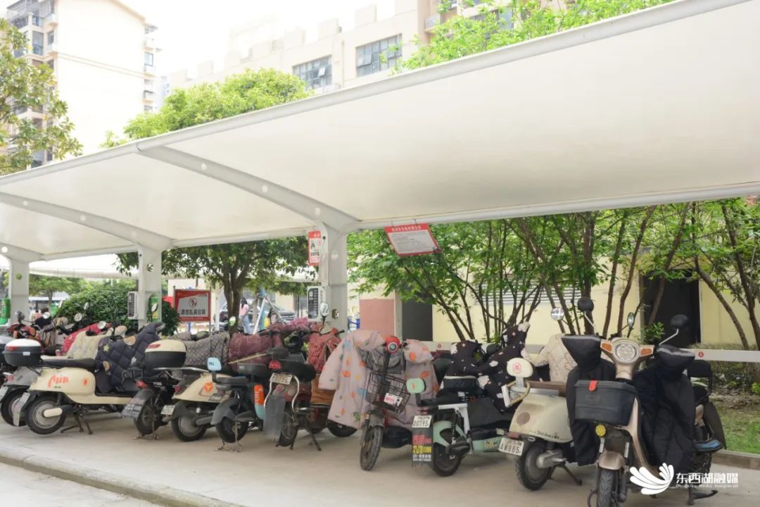 近日,4个非机动车棚顺利建成,可停放约300辆电动车,可同时为80台电动车充电,并配有消防设备。