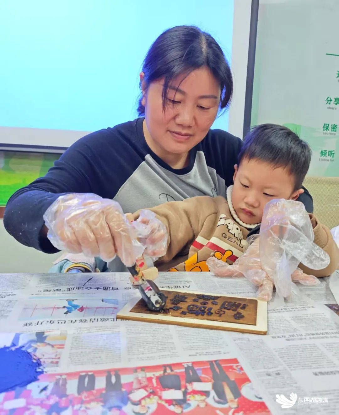 务工返乡的舒大姐,双手因常年辛苦劳作略显粗糙,此刻却仿若一位细腻的艺术家,刻板时格外专注,她嘴角上扬,笑着感慨:“在外面忙了一年,回家能参与这样的活动,心里暖烘烘的,年味儿一下子就浓了!”亲子组合区域更是热闹非凡,张晨和孩子紧密协作,孩子眼中满是新奇与探索,不时好奇发问,张晨则在一旁耐心引导。她说:“就想让孩子多接触传统文化,这次活动办得太及时、太有意义了。”困境儿童小徐也全程沉浸其中,完成作品的那一刻,脸上绽放出灿烂笑容,满是成就感。