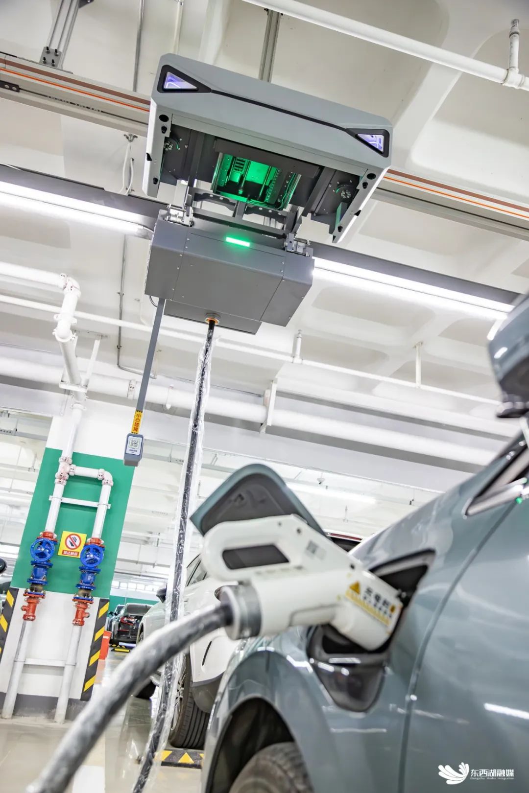 驱车前来的顾客,可享湖北独家首发的机器人充电服务,顾客车停哪里,机器人便会沿着轨道滑行到顾客停车位,扫码即可充电,还可自助洗车。