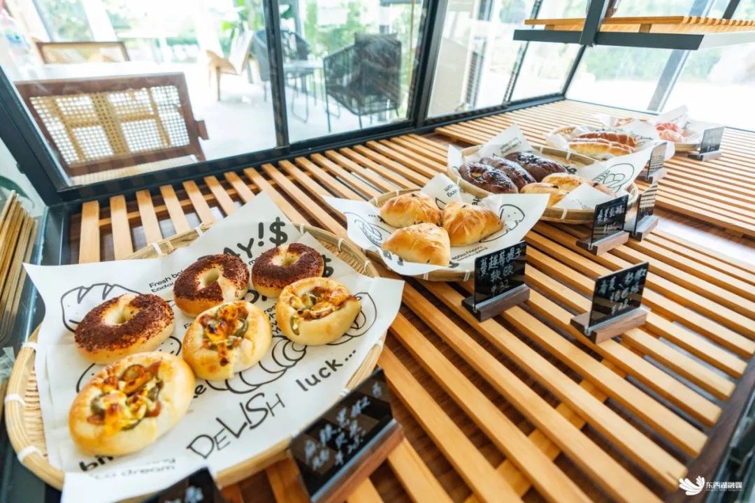 咖啡馆一层大院,摆放着一排遮阳伞和露营桌椅,每组座位间都贴心地隔出了2-3米的社交距离,客人要么端着咖啡杯小酌、拍照,要么望着茶园发呆。不远处,还有配套的柴窑面包炉,新鲜出炉的面包现烤现吃,微焦的面皮混合面粉香。