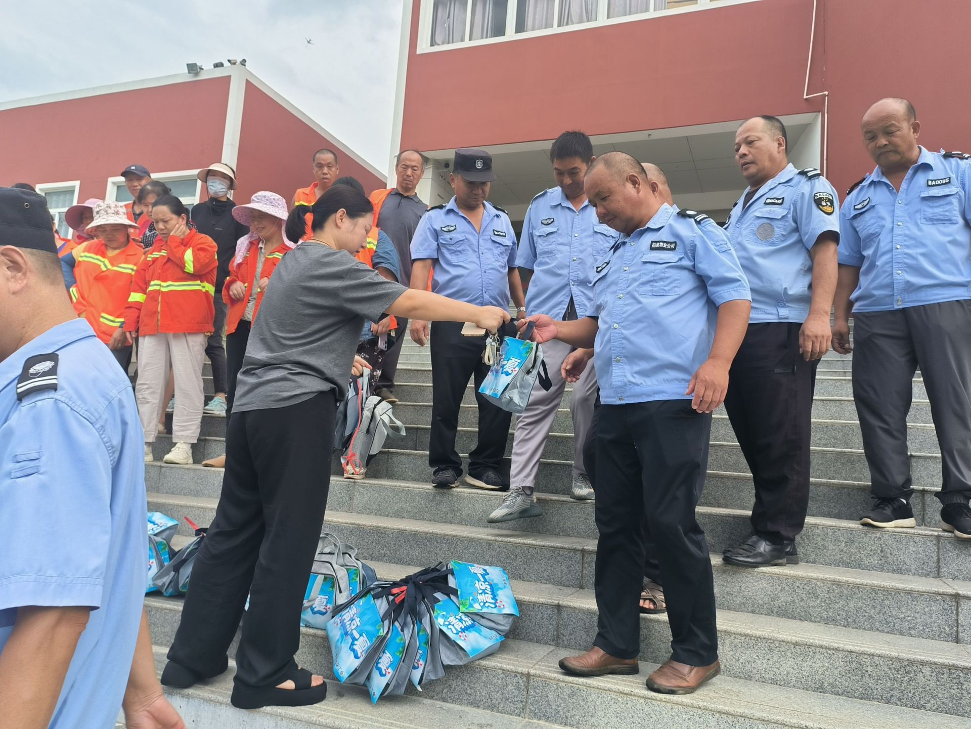 “师傅,您辛苦了!这么热的天还在外面工作,一定要注意身体,这些清凉物资希望能帮您缓解一下暑气。”社区书记张晓晶同志一边说着,一边将清凉包送到一位保安手中。他接过清凉包,脸上露出了朴实的笑容,感激地说:“谢谢你们这么关心我们,在这么热的天还想着我们,这些东西太实用了,我们干活更有劲儿了!”