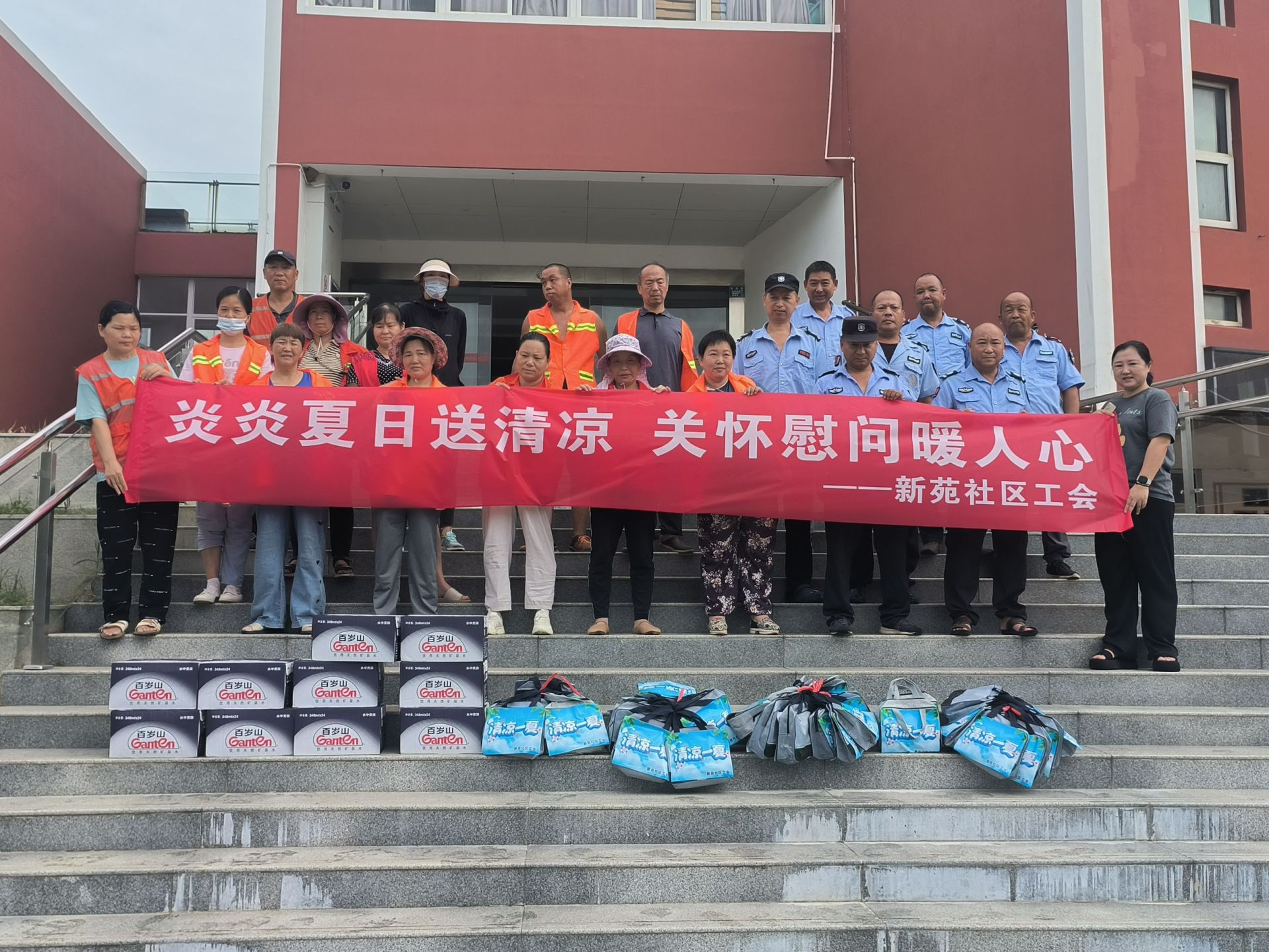 为切实做好高温季节防暑降温工作,保障户外劳动者的健康权益,新苑社区工会于8月8日组织开展“夏日送清凉”慰问活动,为坚守在高温一线的保安、保洁员、快递员等户外劳动者送去防暑降温物资,传递工会组织的关怀与温暖。