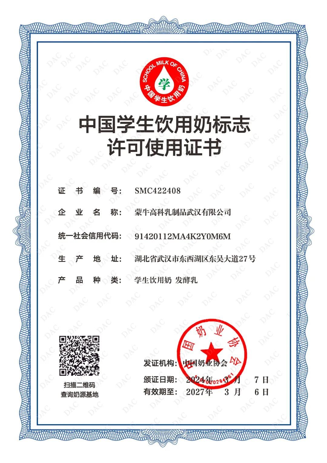 蒙牛低温(武汉)工厂获“中国学生饮用奶定点生产企业”资质。