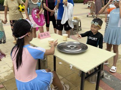 广场另一侧的“游戏区”藏着更多惊喜。白色长桌上,粉色指示牌格外醒目,工作人员正用纸杯演示“水上接龙”游戏。戴蓝色帽子的小男孩踮脚递出纸杯,旁边戴白帽的老人帮忙扶稳桌沿,穿粉色雨衣的小女孩拉着妈妈排队,轮到自己时眼睛亮得像星星。家长们不再是旁观者,有的蹲下来帮孩子稳住水杯,有的给邻座家庭支招,陌生感在协作中悄悄融化。