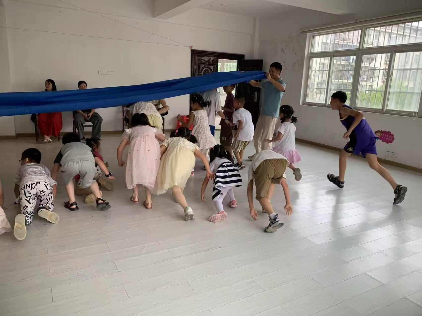 趣味游戏环节成为全场亮点。“溜溜布” 游戏中,孩子们化身 “小探险家”,布面平铺时争相匍匐前进,布被拉起成 “山洞” 时又雀跃着弯腰穿梭,偶尔被抖动的布面 “掀” 起衣角便笑得前仰后合;当布面化作 “波浪” 起伏,大家又手拉手跟着节奏蹦跳躲闪,过程中不忘伸手搀扶差点摔倒的伙伴,稚嫩的互助里满是童真暖意。家长们在旁笑着拍手指引,现场欢呼声与笑声交织,热闹非凡。