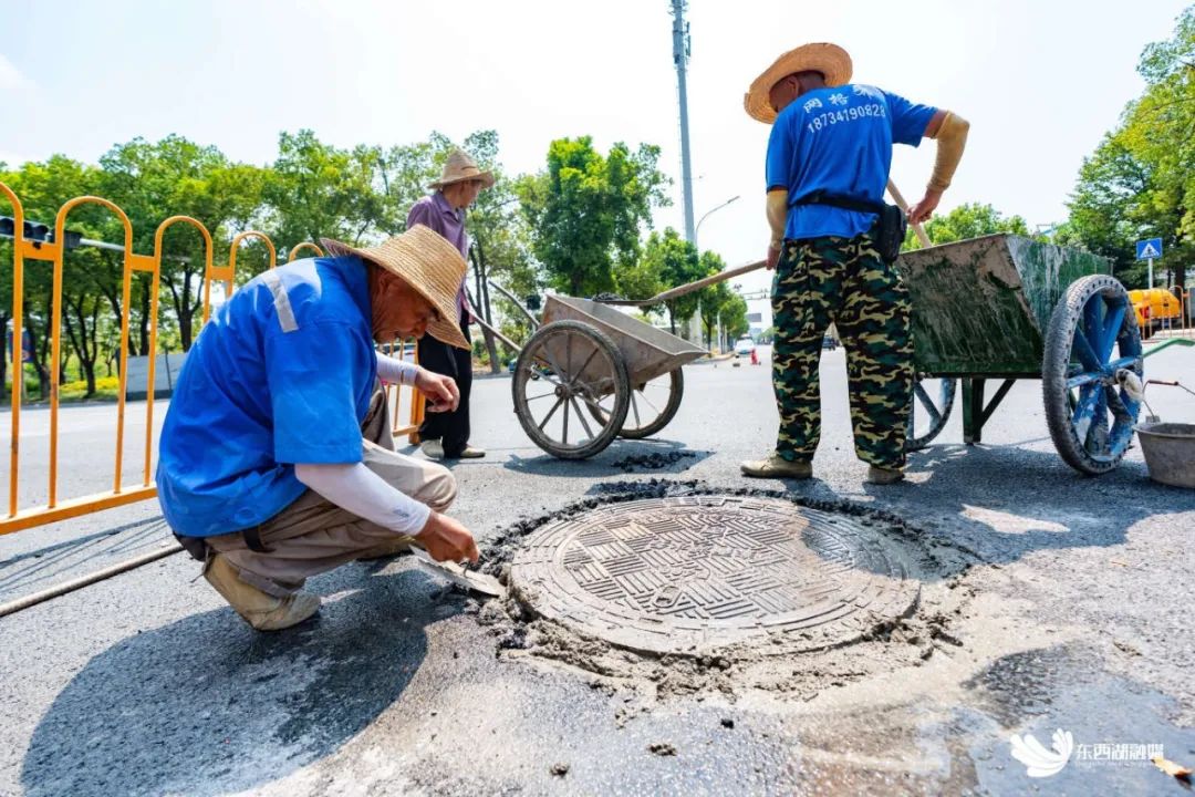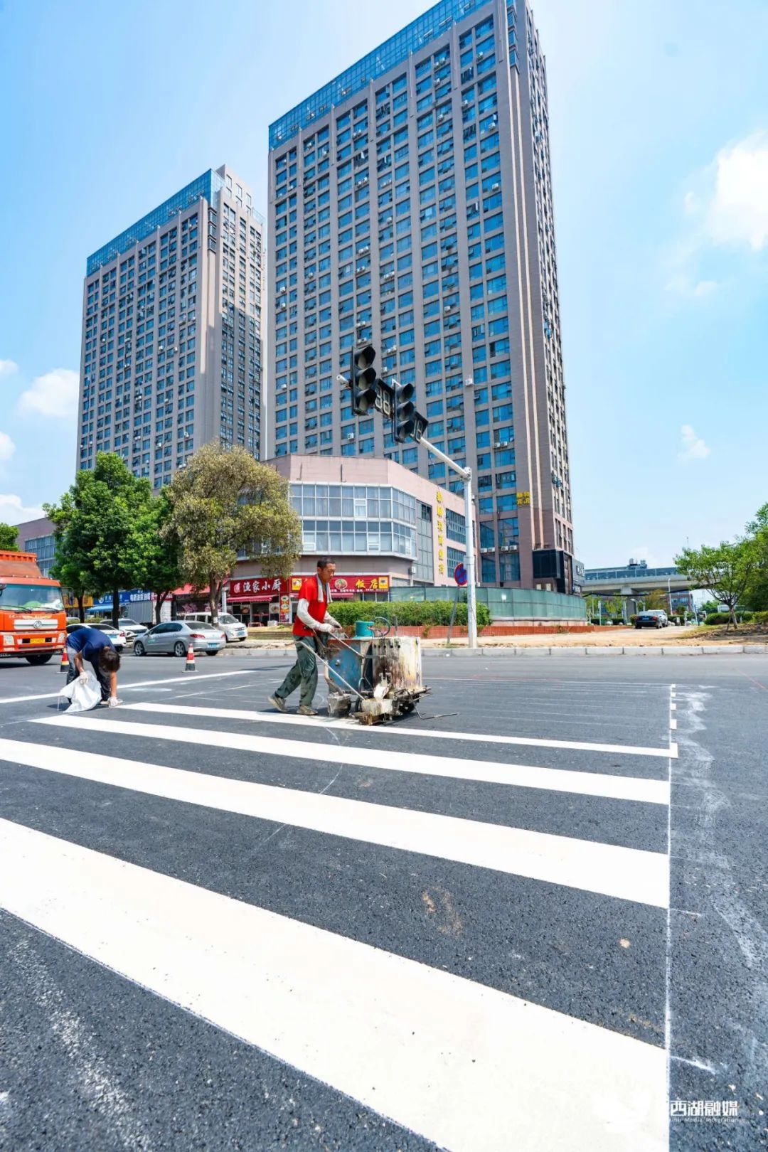 记者在高桥五路与万国街路口处看到,施工人员手持专业标线喷枪,在路面上精准作业。白色的热熔标线漆在喷枪的喷涂下,均匀地附着在崭新的柏油路面上,清晰的车道线、斑马线逐渐成形。