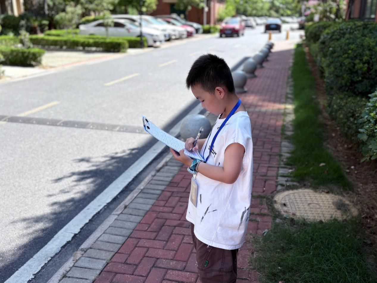 随后,亲子家庭分头“巡园”,把出入口、停车场、拐弯处等6处隐患点一一记录在“安全小侦探”手册上。“这里要贴‘注意车辆’提示!”“我想画一条彩虹路,让小朋友一眼就看见安全通道。”回到驿站,孩子们拿起画笔,将“金点子”变成一张张童趣十足的安全指引牌,有戴头盔骑平衡车的卡通形象,有牵着爸爸妈妈过马路的温馨场景,也有“不要蹲在车前车后”的醒目提示。