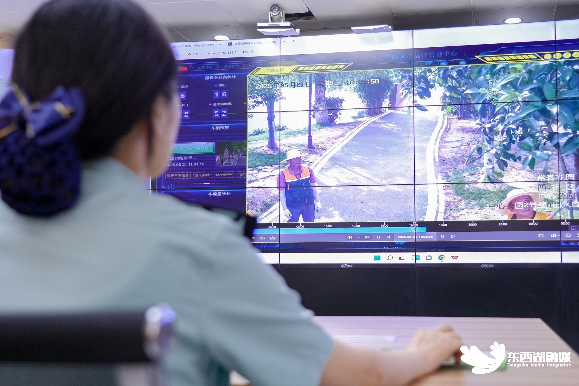 常青花园城运中心工作人员通过监控查看工作人员清理遮挡树枝。