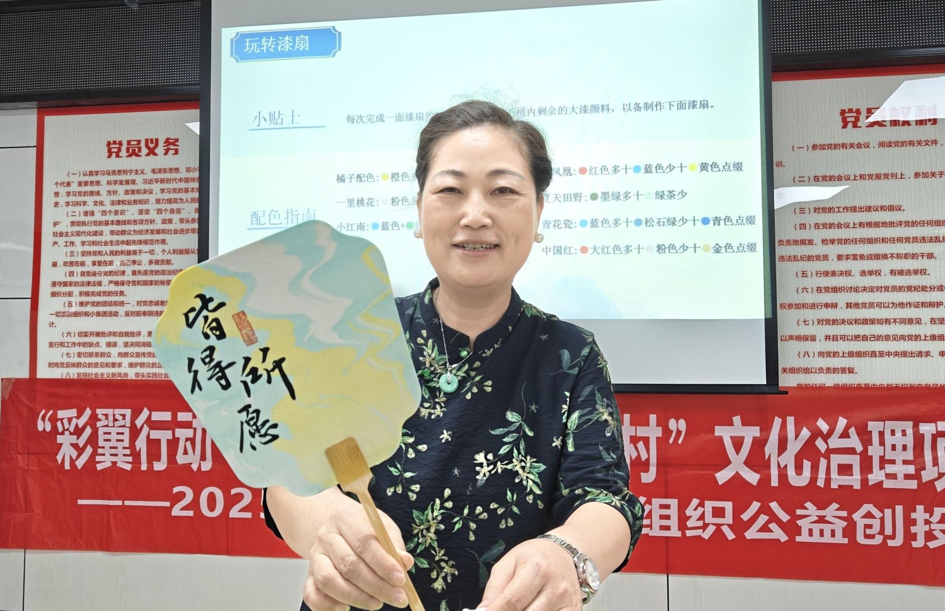 活动伊始,社工围绕漆扇的历史渊源、文化内涵及制作工艺展开详细讲解。通过展示不同朝代、不同风格的实物与图片,生动介绍了漆扇从选材、制骨、裱面到上漆、绘制等一系列复杂工序,让志愿者们直观感受其独特魅力。同时,工作人员还结合传统纹样与现代审美,分享了漆扇绘制的技巧与创意思路。