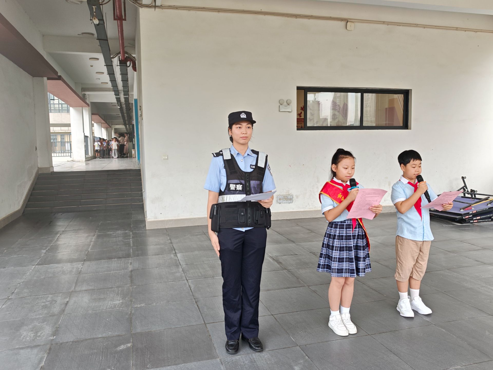 “开学第一天,安全要先行!”在走马岭街东方红小学操场,社区民警徐志国结合小学生的年龄特点和认知水平,通过趣味提问、案例讲解、互动演示等形式,围绕交通安全、消防安全、防溺水安全、防校园欺凌、防拐骗以及网络安全等核心内容展开宣讲。