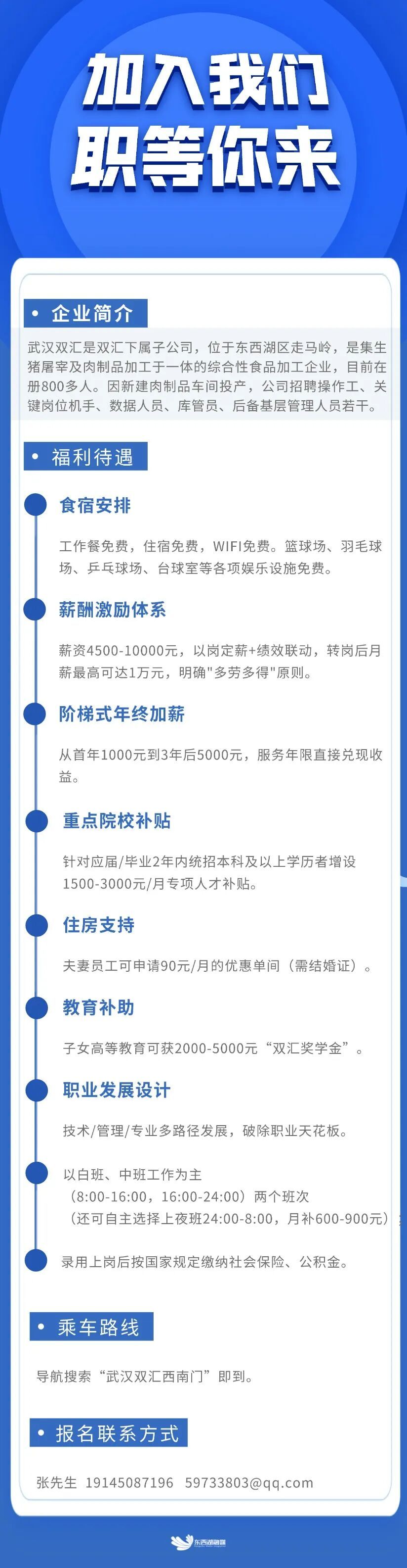 东西湖融媒从区人社局获悉,湖北武汉双汇食品有限公司(下称武汉双汇)近期招聘生产操作、技术管理、仓储物流等多领域岗位若干人。