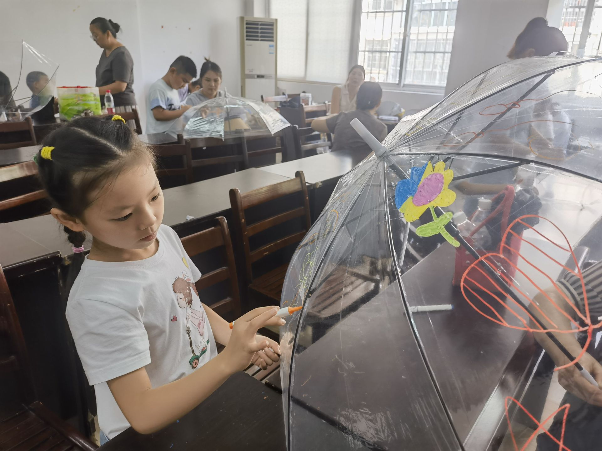 创意涂绘透明雨伞将活动推向高潮。孩子和家长默契配合,发挥想象,用色彩笔在雨伞上创作。有的绘出小动物,有的画梦幻星空,色彩碰撞间,一把把普通雨伞变身“艺术作品”。涂绘中,孩子释放创造力,家长耐心陪伴,亲子关系在创作互动中升温。