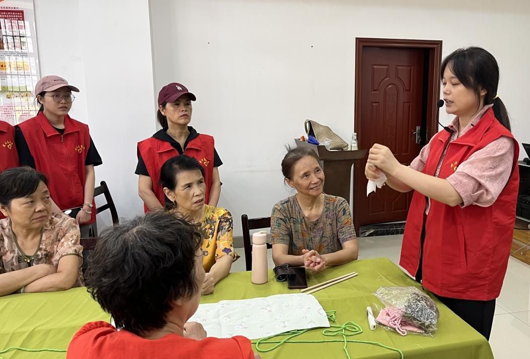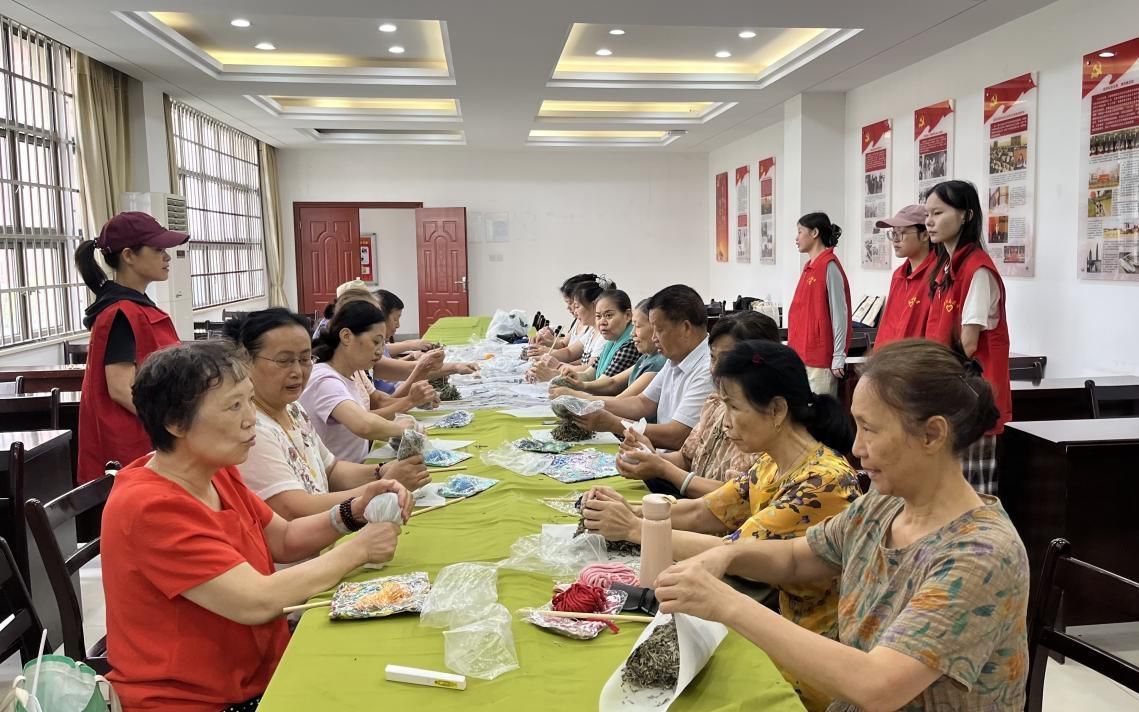 志愿者就蹲在年老居民身边,帮助整理布套、递绑绳;旁边的赵奶奶则忙着给邻居搭把手,“我年轻时做过针线活,你这绳系松了,我帮你紧一紧。”不一会,一个个散发着艾草清香的艾草锤就完成了,老人们捧着自己的作品,脸上满是成就感。