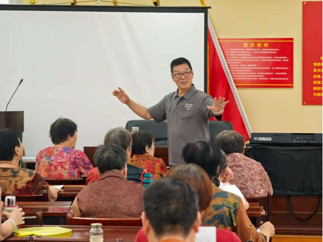 活动中,黄老师带领大家进行了发声练习,还耐心地纠正了他们的音准和节奏问题。在黄老师的悉心教导下,集体演唱了歌曲《十送红军》。课堂融合“教、学、唱、悟”多种形式,在歌声中感悟历史、交流情感。激昂嘹亮的歌声在社区活动室内回荡,激发了组员们内心深处的爱国热情与集体荣誉感。唱响红歌不仅重温了历史,更汲取了奋进的力量。 随着旋律的起伏,大家仿佛回到了那个激情燃烧的岁月,他们的眼神中闪烁着对过往岁月的怀念和对未来的无限憧憬。合唱公益课堂不仅是一个学习音乐的平台,更是社区居民增进交流、凝聚邻里情的温馨家园。在这里,不同年龄、不同背景的居民因音乐相聚,大家相互学习、共同进步,在歌声中传递着对生活的热爱和对社区的关怀。