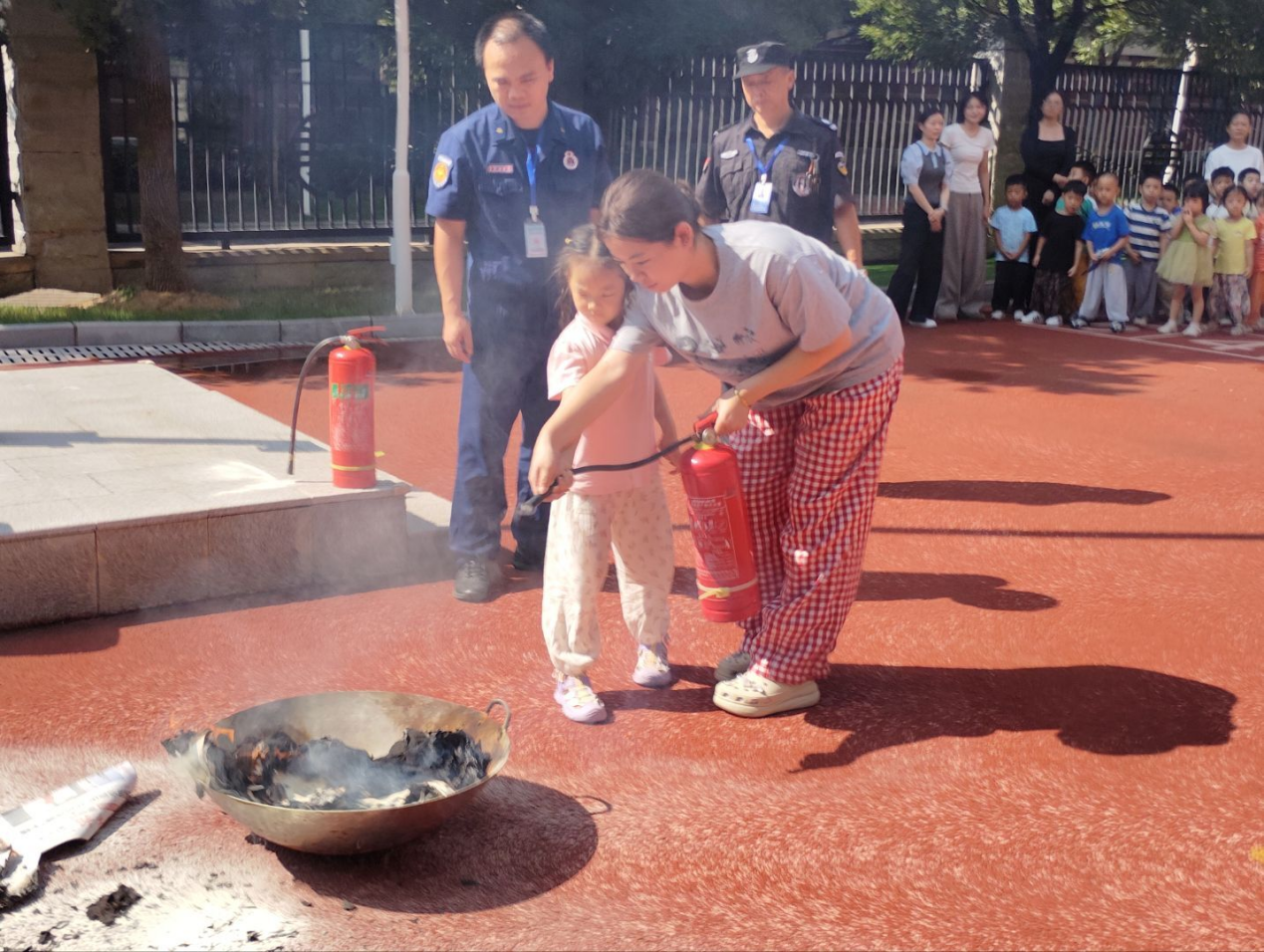 随着模拟火灾警报响起,演练正式开始。在老师和消防队员的引导下,小朋友们迅速有序地按照预定逃生路线,用湿毛巾捂住口鼻,弯腰快速撤离至操场安全区域,整个过程紧张有序,仅用时3分钟便完成全员疏散。此外,现场还演示了灭火器的使用方法和水枪的出水方法,并邀请师生实操体验。