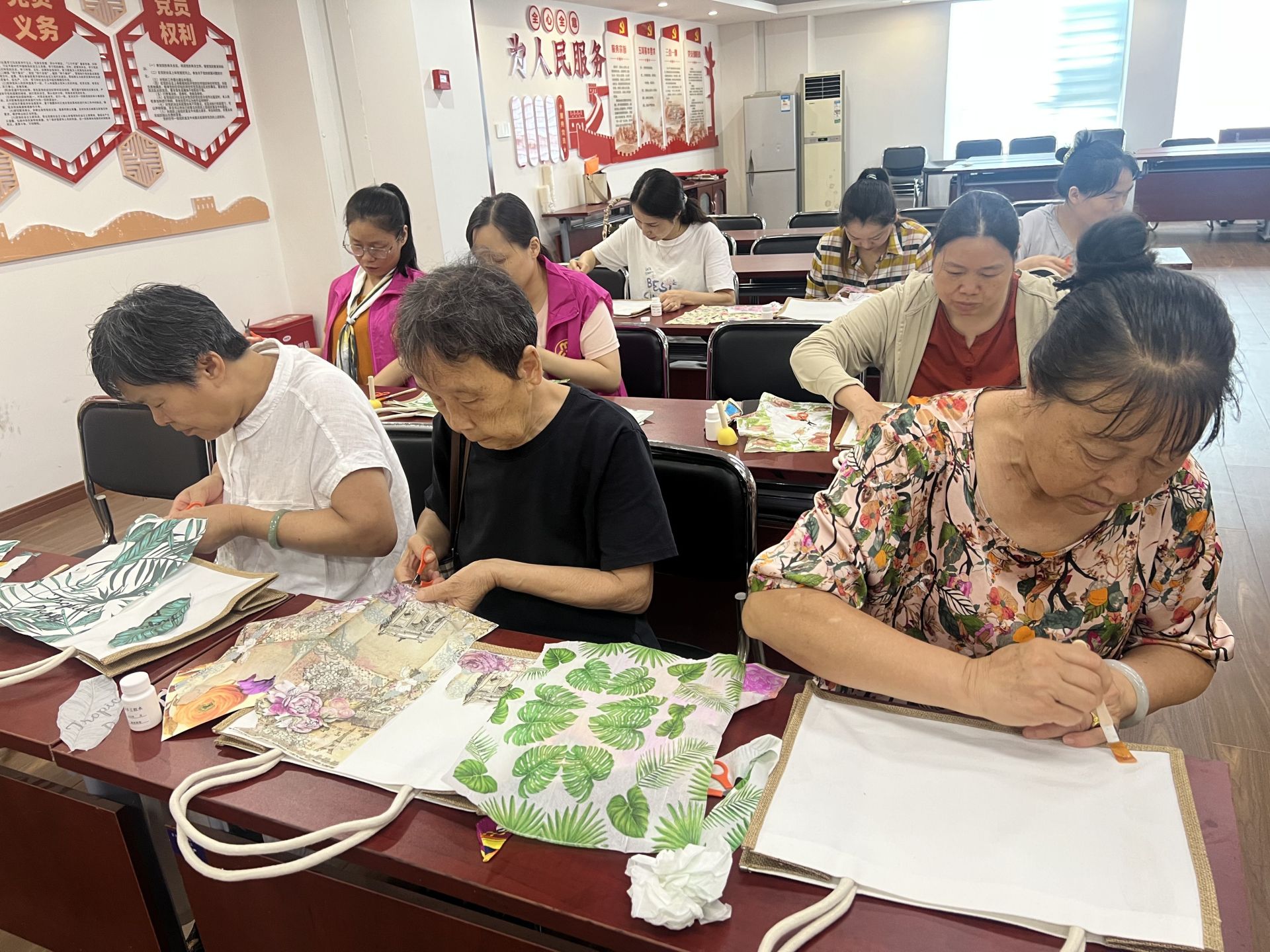 活动尾声,大家纷纷展示成果:有的包上是灵动的花鸟蝴蝶,有的包上是可爱的卡通形象,有的是简约的几何纹样,每一个都独具特色。“以前总觉得手工课离自己很远,没想到在家门口就能学,还做出了这么好看的包,太有成就感了。希望社区以后多办这样的活动!”年长的周婆婆提着亲手制作的花朵包开心地说道。