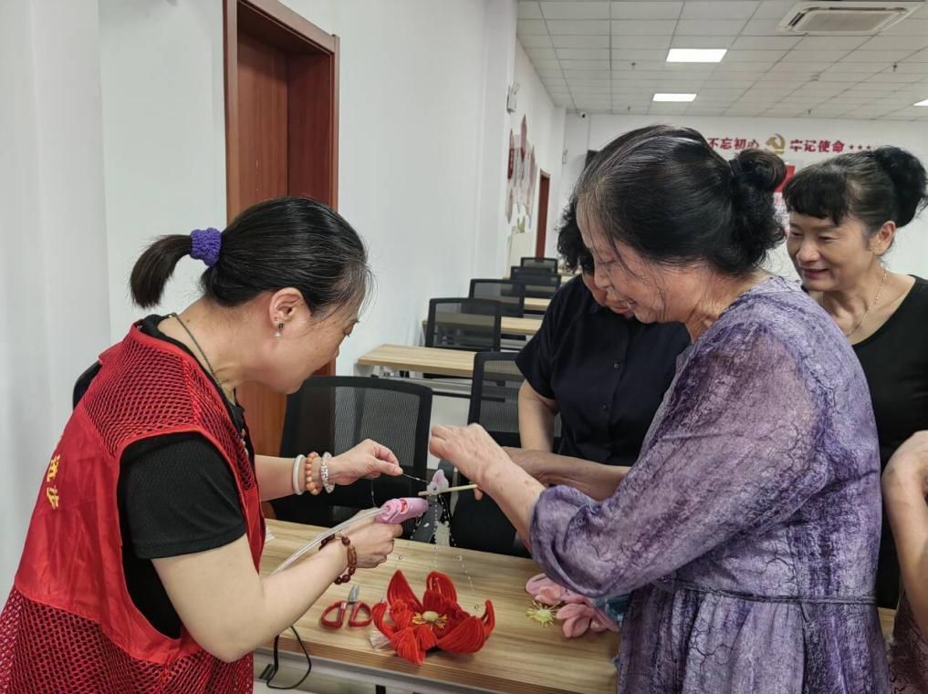 工作人员指导居民制作手工。