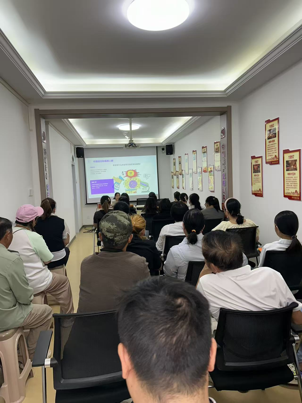 活动现场,特邀请区妇幼保健医院医生进行专题讲座。李医生结合冬季气候特点,详细讲解了流感、诺如病毒感染、支原体肺炎、手足口病等常见传染病的传播途径、典型症状及预防要点:“流感病毒主要通过飞沫传播,出现发热、咳嗽等症状要及时居家休息;诺如病毒易引发呕吐腹泻,做好手卫生和饮食卫生是关键。”