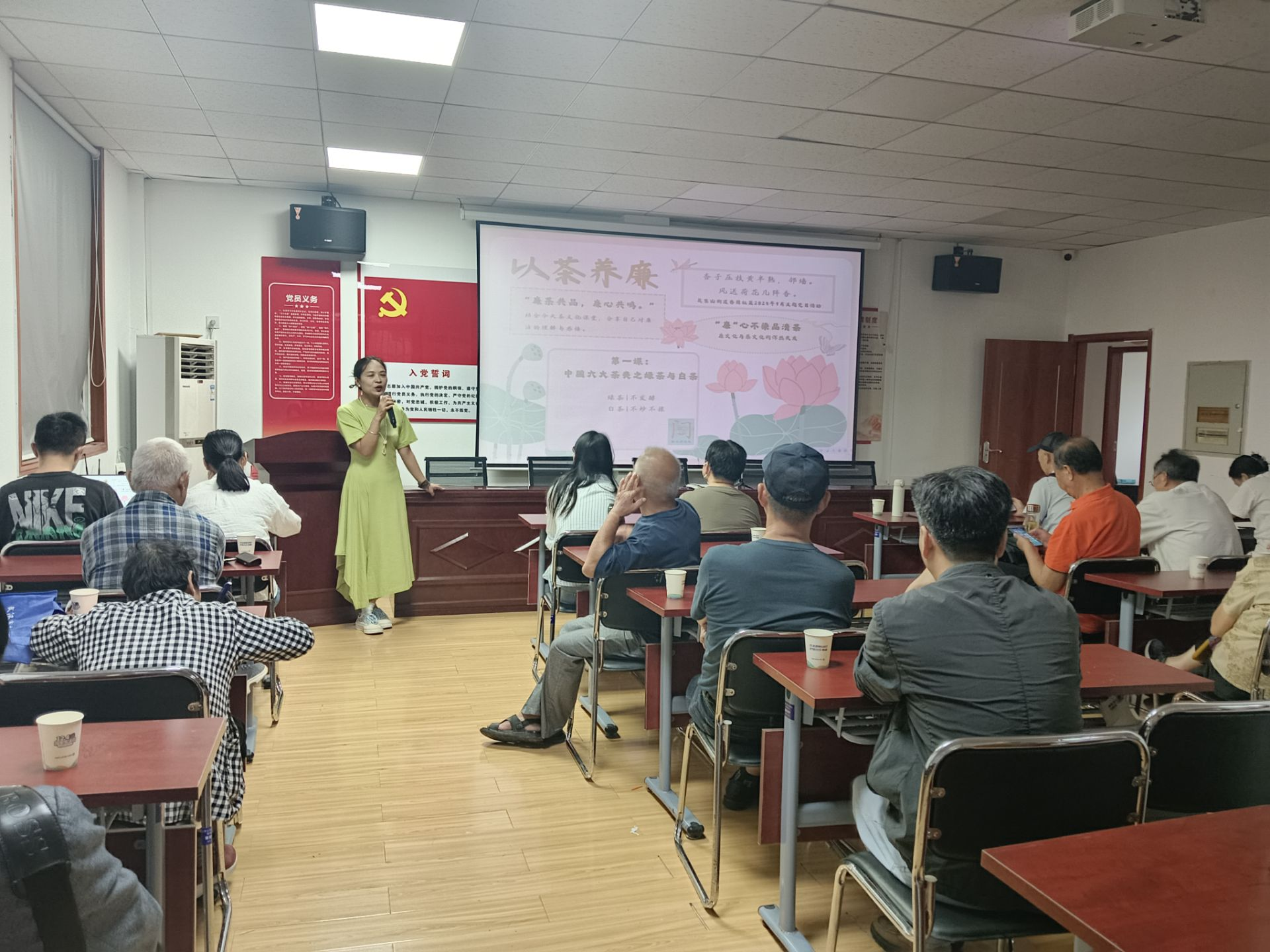 活动现场,社区邀请的退休老党员万师傅率先开讲。拥有30年党龄的他,结合自身经历与茶文化典故,从 “茶之淡” 对应 “廉之守”、“茶之洁” 象征 “政之清” 两个维度,生动阐释了廉洁与茶文化的内在关联。“就像绿茶不施粉黛、保留本真,党员干部也要守好初心、不慕虚荣。” 万师傅的话语朴实却深刻,引发在场党员的强烈共鸣。