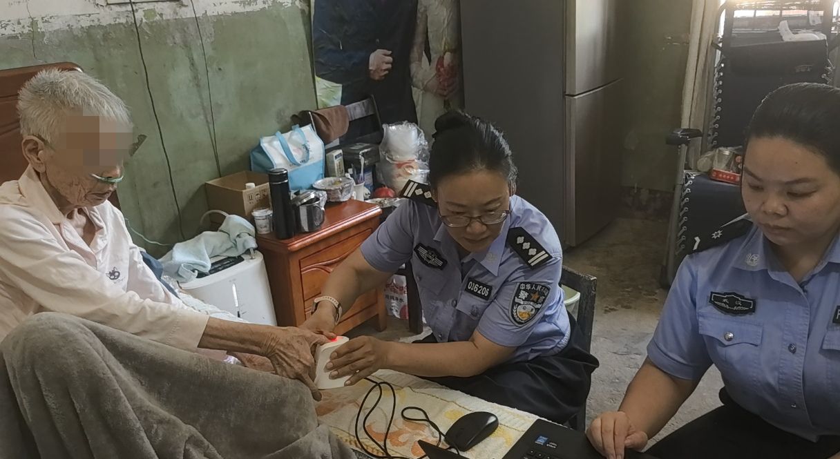 9月16日上午,民警带领辅警方婷携带着专业设备,来到张女士家中,现场开展业务办理。由于老人长期卧床,导致手臂瘦弱无力,指纹干涩难以采集。民警耐心为老人擦拭手指,逐指尝试指纹采集,成功完成指纹录入工作,并顺利完成各项业务办理手续,进入制证流程。