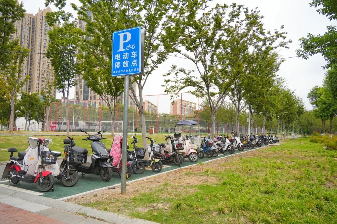 / 深蓝色指引牌上“电动车停靠点”字样清晰可见,市民得以快速识别、规范停车