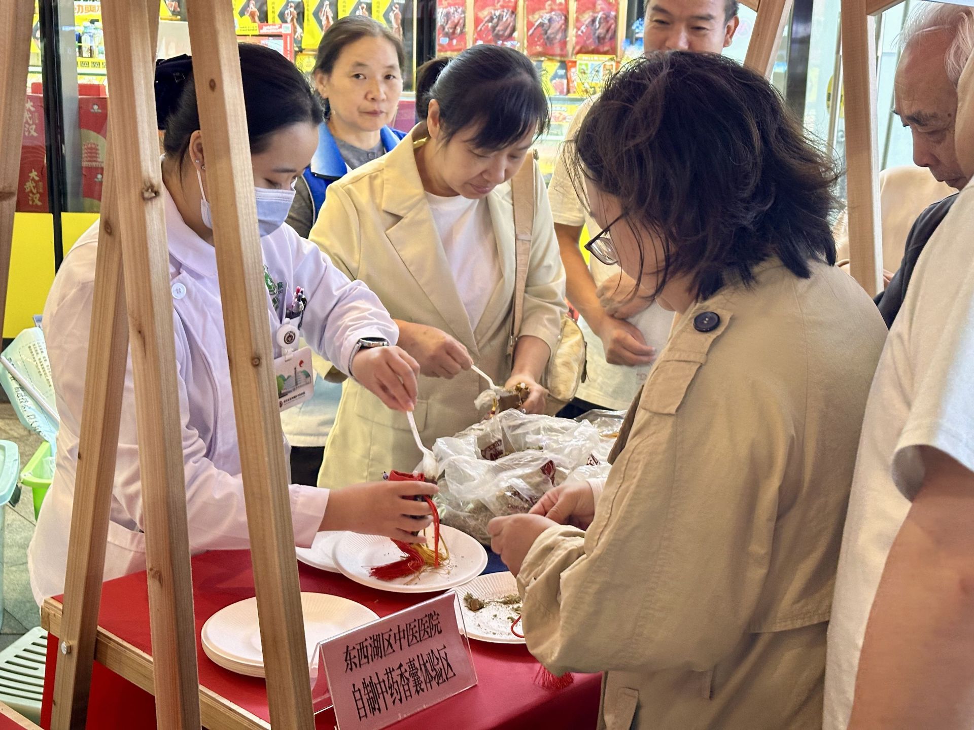 在“中草药展示与香囊制作区”,陈列着多种常见中药材标本。居民们不仅能观看、嗅闻,还能在医护人员指导下,亲手配制内含薄荷、艾叶、藿香等药材的中医药特色香囊。工作人员介绍,中药香囊源自中医“衣冠疗法”,这一互动环节极大地激发了居民们对中医药文化的兴趣。