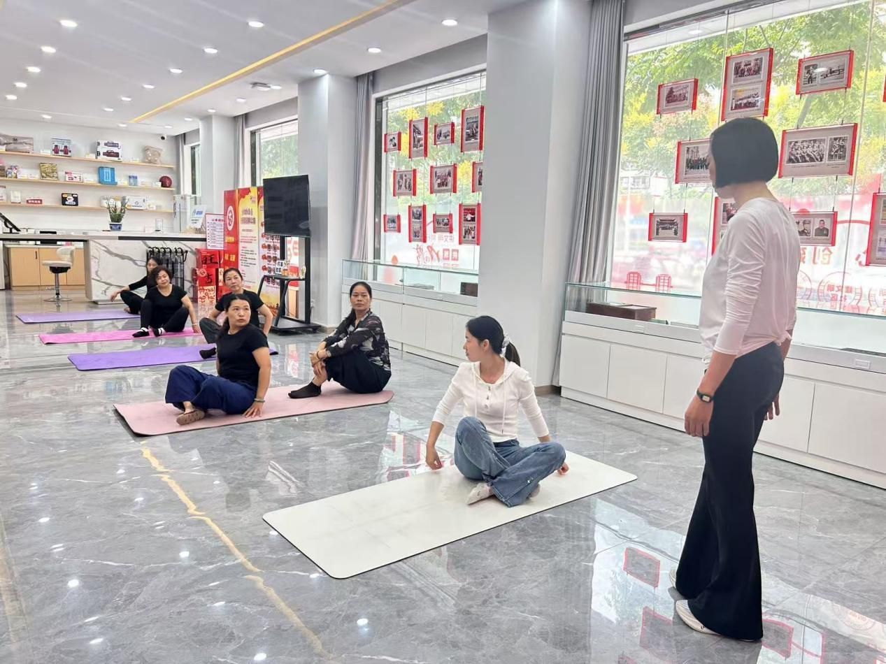 “吸气,感受脊柱向上生长。呼气,让压力与疲惫自然流淌……”伴随着轻柔的指导语,社区女性居民同步呼吸,共同体验瑜伽的魅力。9月23日,将军路街将军路社区首场公益瑜伽课在党群服务中心大厅一楼温暖开展。