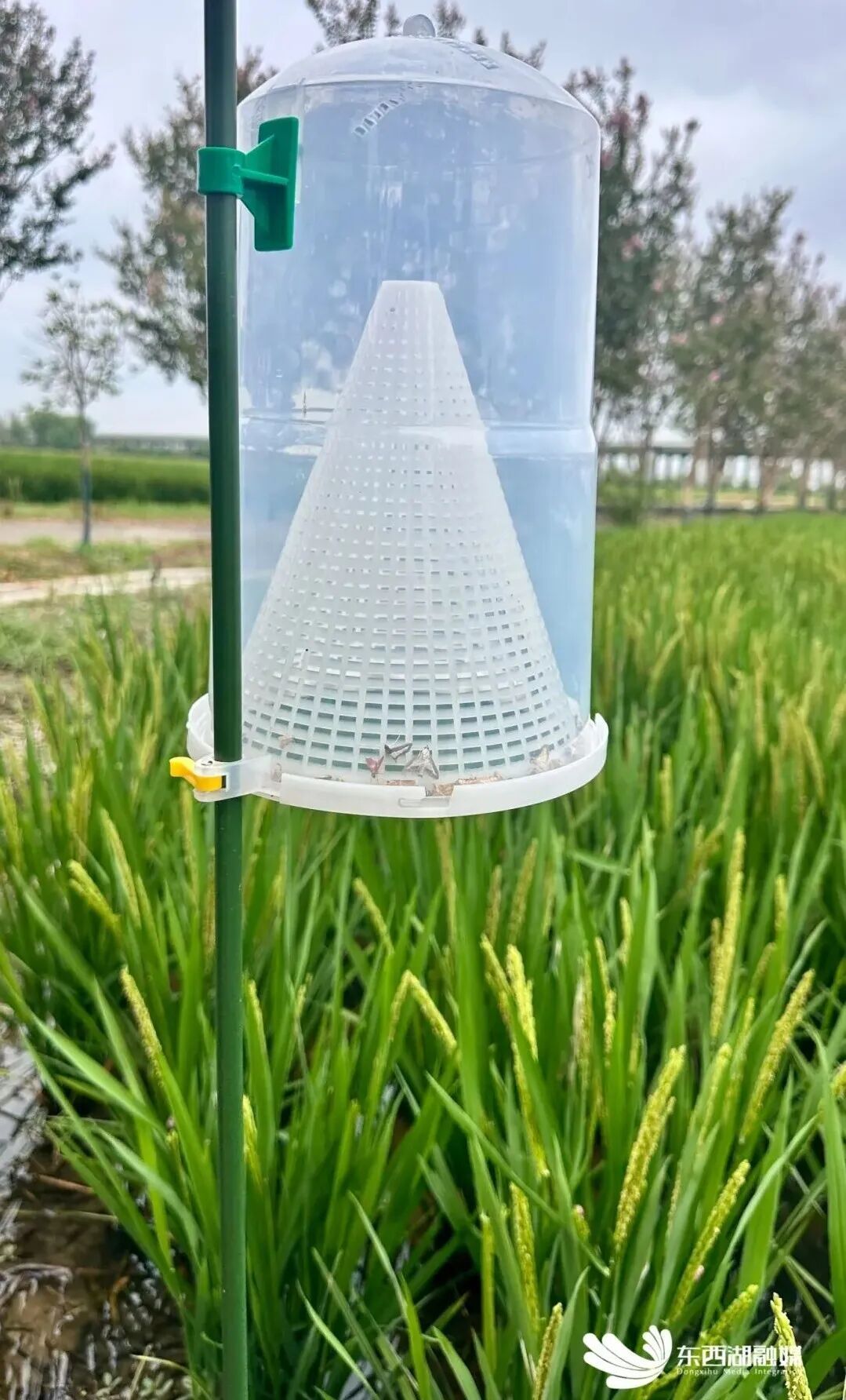 在鑫三江田园综合体的500亩水稻示范区,绿色防控技术同样成效显著。太阳能杀虫灯与性诱捕器组成“智能护卫队”,守护稻田生态。技术员介绍,性诱捕器通过释放人工合成的雌虫信息素吸引雄虫,阻断繁殖链;风吸式太阳能杀虫灯则利用害虫趋光特性,以特定波长LED光源诱虫,再通过风机吸入收集器。每台杀虫灯每晚可诱杀害虫200-300克,且基本不伤益虫。