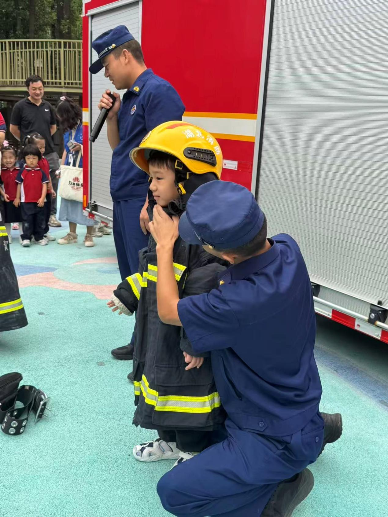 在武汉市实验幼儿园(橡树园)活动现场,消防人员成了孩子们眼中的 “超级英雄”。为了让小朋友们更直观地了解消防知识,消防人员特意带来了全套消防装备,并通过生动有趣的方式展开互动。“小朋友们,你们知道消防员叔叔身上这件衣服有什么神奇的作用吗?” 随着消防人员的提问,孩子们纷纷举起小手,好奇地打量着厚重的消防服。随后,消防人员现场演示了消防服的穿戴流程,从头盔、上衣、裤子到消防靴,每一个步骤都讲解得清晰易懂,还邀请勇敢的小朋友亲自体验穿戴消防服,感受 “小小消防员” 的责任与担当。