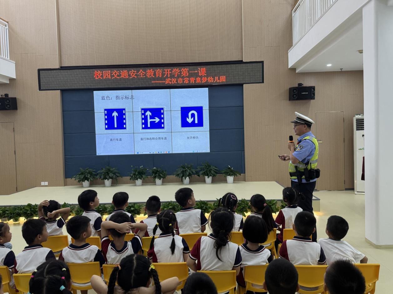 为筑牢幼儿安全出行防线,武汉市童梦幼儿园近日邀请交警走进校园,开展趣味交通安全讲座。讲座伊始,交警叔叔用色彩鲜艳的卡通展板,逐一讲解红绿灯、斑马线、禁止通行等交通标志,还通过“交通标志猜猜看”小游戏,让孩子们举手抢答,现场氛围热烈。随后的“小司机过马路”情景模拟环节,孩子们化身“小行人”“小司机”,在交警指导下,规范完成“看信号灯—走斑马线—避让车辆”的全过程,亲身体验安全通行要点。
