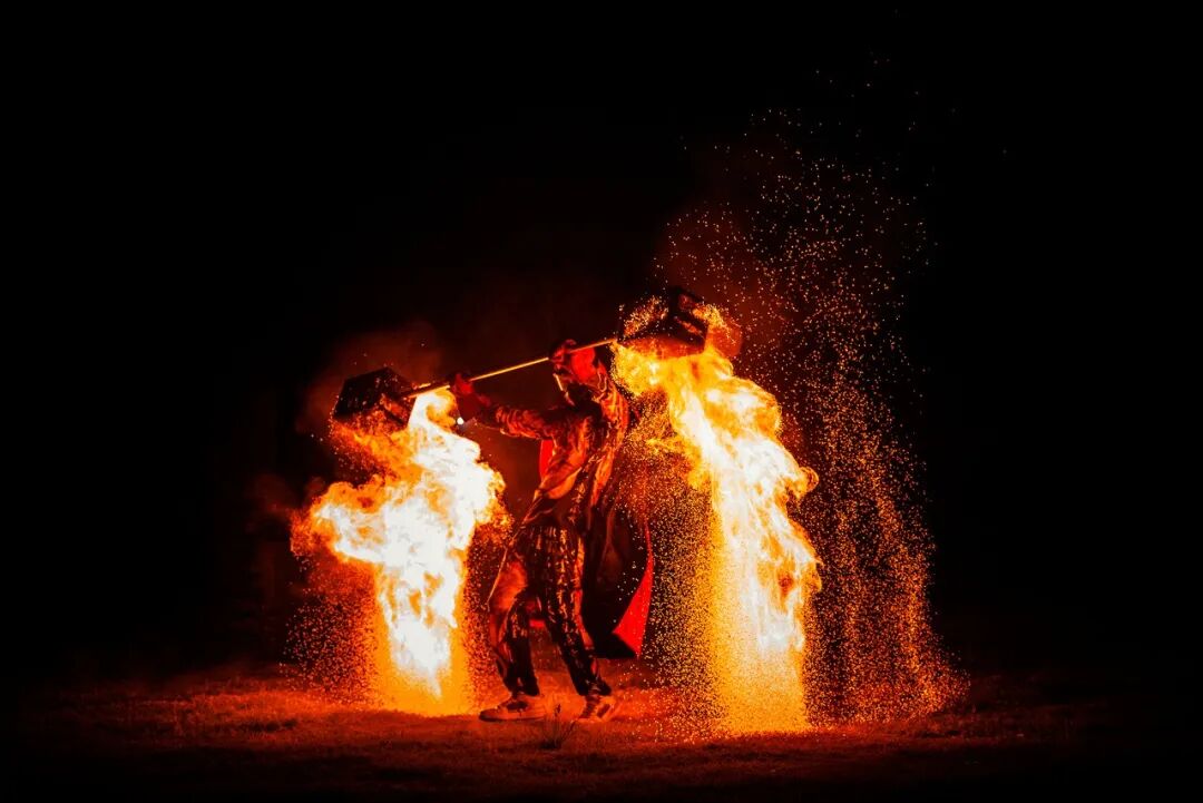 “我们想通过火的不同形态,展现力量、优雅与祝福。”演出策划人介绍。空中飞人如灵鸟般灵动,火舞者手持火棍旋转跳跃,火焰在夜空中划出绚烂轨迹。