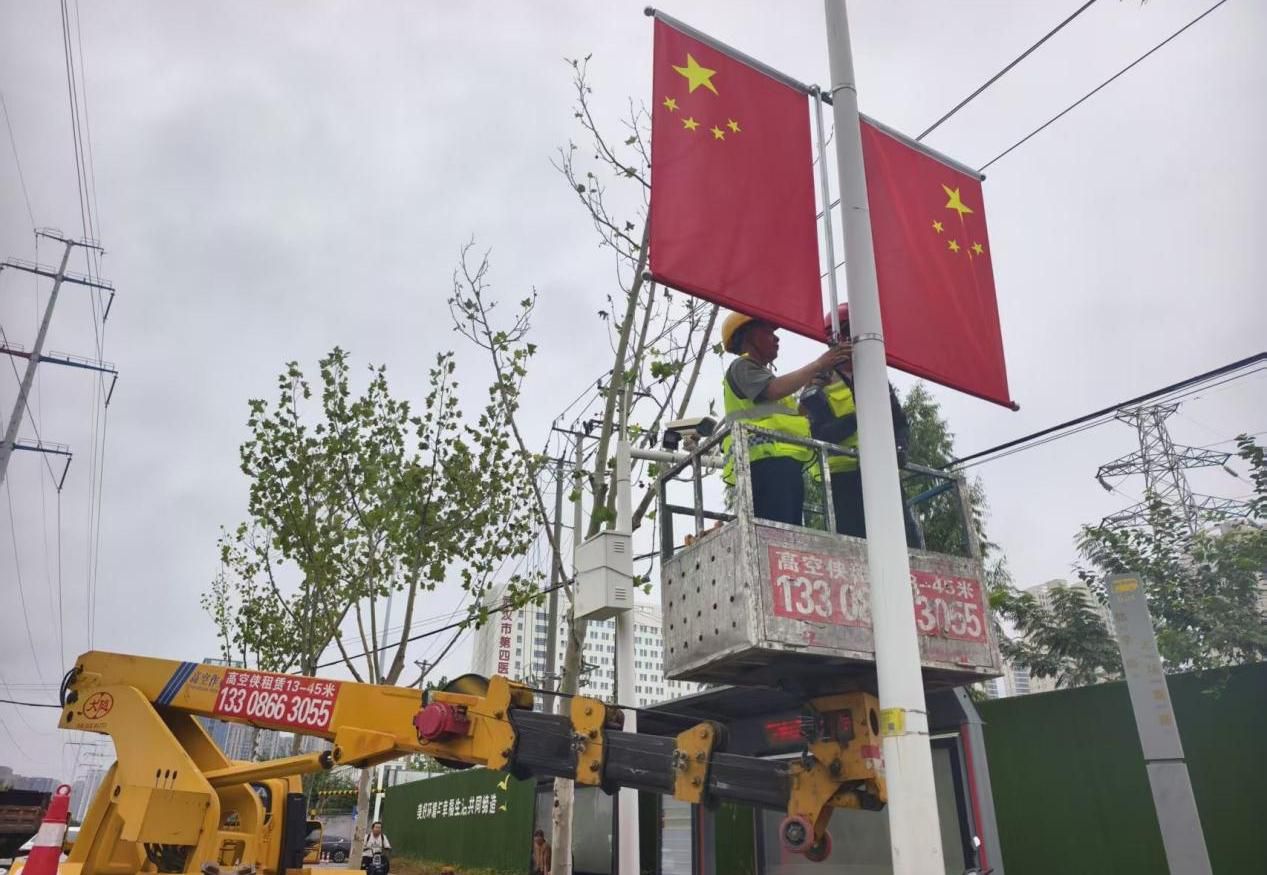 此次国旗悬挂工作时间紧、任务重,公司精选9名经验丰富的工作人员组成专班,提前对辖区姑李路、将军一路、将军路等重点区域进行实地勘察,明确悬挂点位、数量与规范要求,确保国旗悬挂整齐划一、庄重规范。