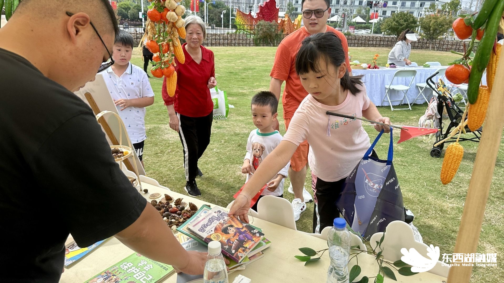 “以书换蔬”传递的是温暖与共享,而“书菜盲盒”区域则洋溢着探索与惊喜。东西湖区图书馆也在此次活动中捐赠了200本图书,将书籍装入盲盒,并融入市民换来的闲置书籍,共同打包成创意盲盒。参与者通过套圈、画画等小游戏收集“蔬菜币”,集满五枚即可摘取一颗“知识果实”。