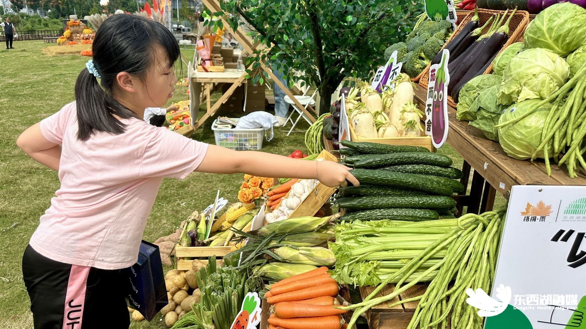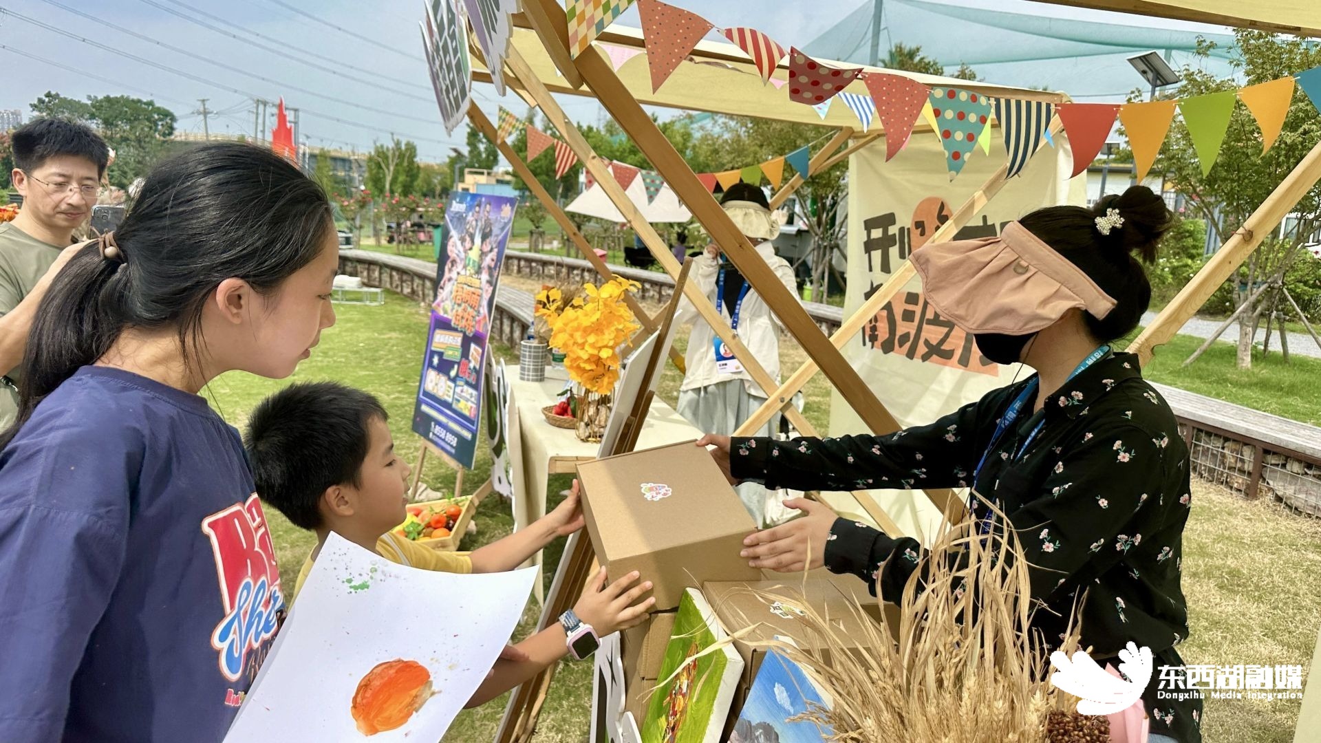 活动体验从创意互动开始。在“创艺蔬菜艺术工坊”里,孩子们用茄子、青椒等蔬菜蘸取颜料,在画纸上留下天然的印记。8岁的赵天宇虽然没学过画画,却玩得十分尽兴,“你看,我这个南瓜印出来像一朵花!”他举着自己的作品开心地展示。许多家庭在这里驻足,通过蔬菜拓印或自由绘画,创作出独一无二的秋日纪念。完成作品后,参与者还可拍照打卡,领取一束用生菜精心包扎的“菜花”,将这份田园诗意带回家。