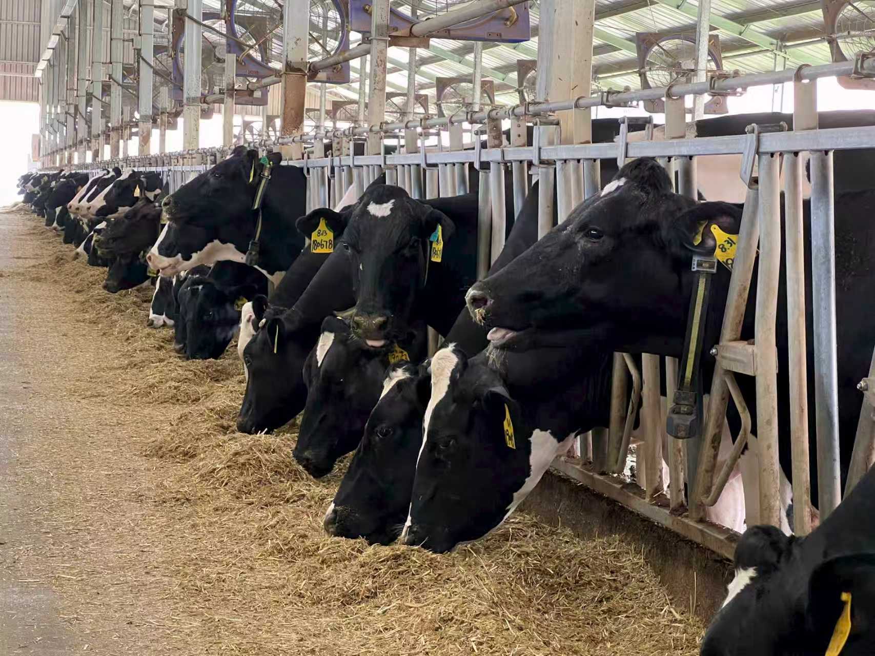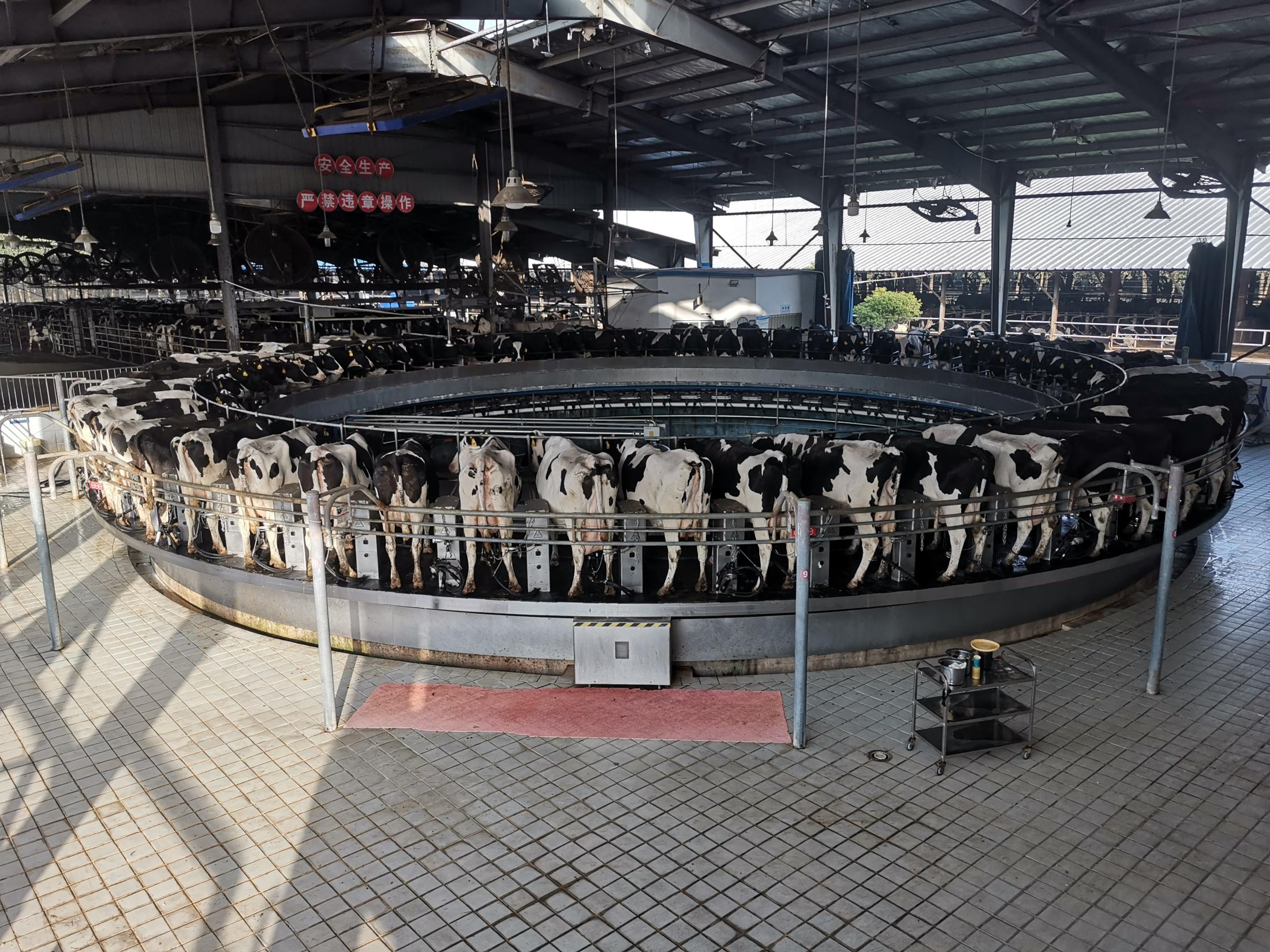 清晨六点,牧场挤奶厅已有序运转,奶牛依次登上转盘式挤奶机,耳边佩戴的电子耳标被自动扫描识别相关数据实时上传至管理系统。