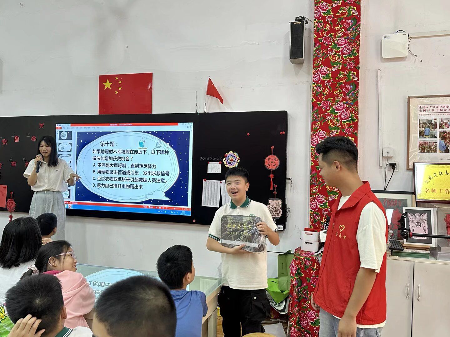 活动首阶段,区应急管理局科普老师为七年级学生带来一场沉浸式防震减灾课堂。通过案例分析、互动演示等方式,系统讲解地震预警原理、避险姿势及应急物资准备等知识。课堂尾声设置的5分钟有奖竞答环节将气氛推向高潮,金龙湾社区志愿者协助组织竞赛,为参与竞答的学生送上应急大礼包,有奖竞答激发了学生参与热情,实现了“学中赛、赛中悟”的科普效果。