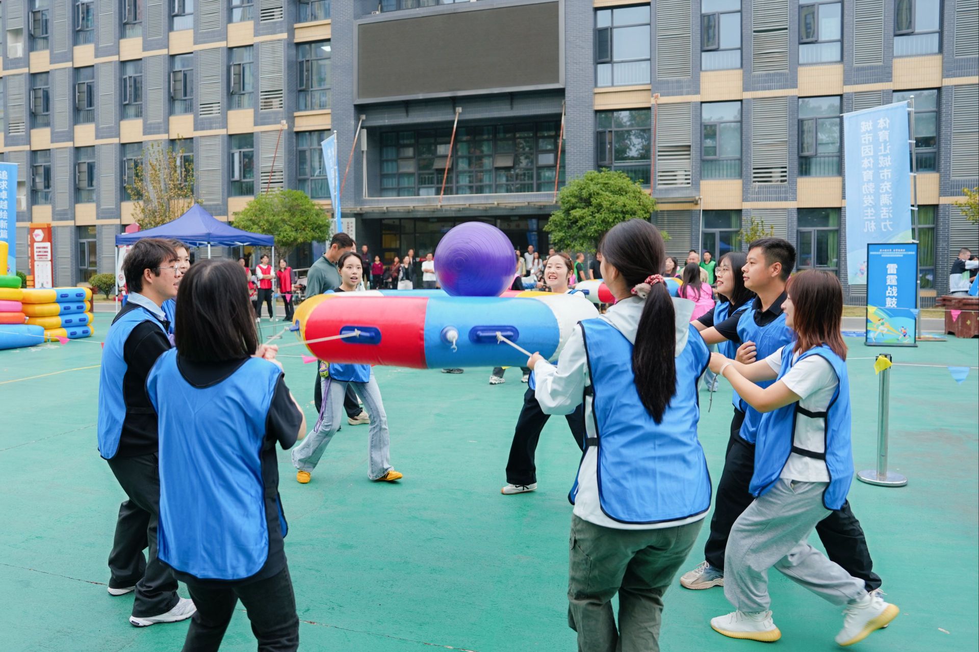 在“雷霆战鼓”比赛区,八个队员紧握绳索,目光紧紧追随着空中跃动的排球。“一、二、三!”队员们齐声呼喊,默契配合,让排球在鼓面上欢快跳跃。每当排球高高弹起,现场便爆发出阵阵喝彩;偶尔失误,队员们也毫不气馁,互相打气后立即重新投入比赛。