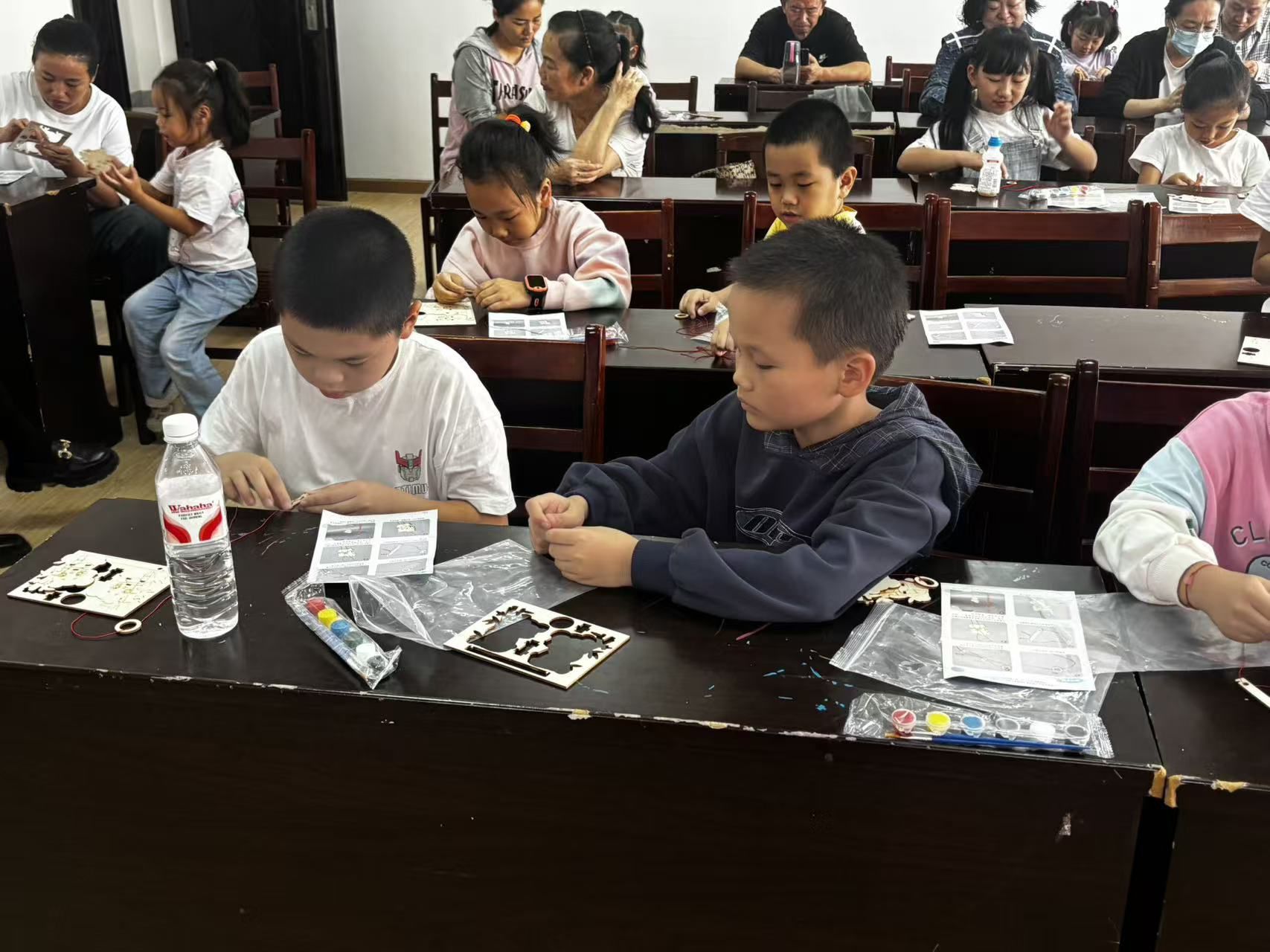最受期待的当属亲子手工师分发木质材料包后,亲子迅速分工:家长组装骨架,孩子粘贴装饰,有的还为熊猫画上“中秋肚兜”。当一个个憨态可掬的木质熊猫成型,孩子们举着作品互相展示,眼里满是成就感。
