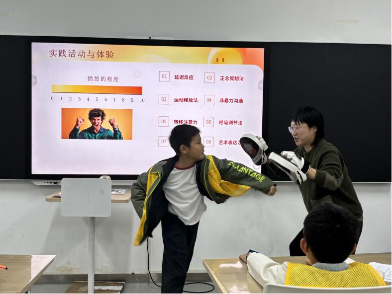 在热烈的“猜谜语”环节,孩子们成为了自己身体的解码员。“愤怒时,我像要爆炸的火球!”“忧伤时,我觉得心里沉甸甸的,想一个人待着。”“害怕时,我的心跳会漏一拍,想找个地方躲起来。”这些生动的描述,让抽象的情绪变得可触可感。老师引导大家:无论是让你面红耳赤的愤怒,还是让你眼眶湿润的忧伤,或是让你手心冒汗的害怕,都是身体在向我们传递重要的信息。学会聆听它们,我们才能真正理解自己,并在情绪波动时,依然能守护住与他人之间的信任纽带。