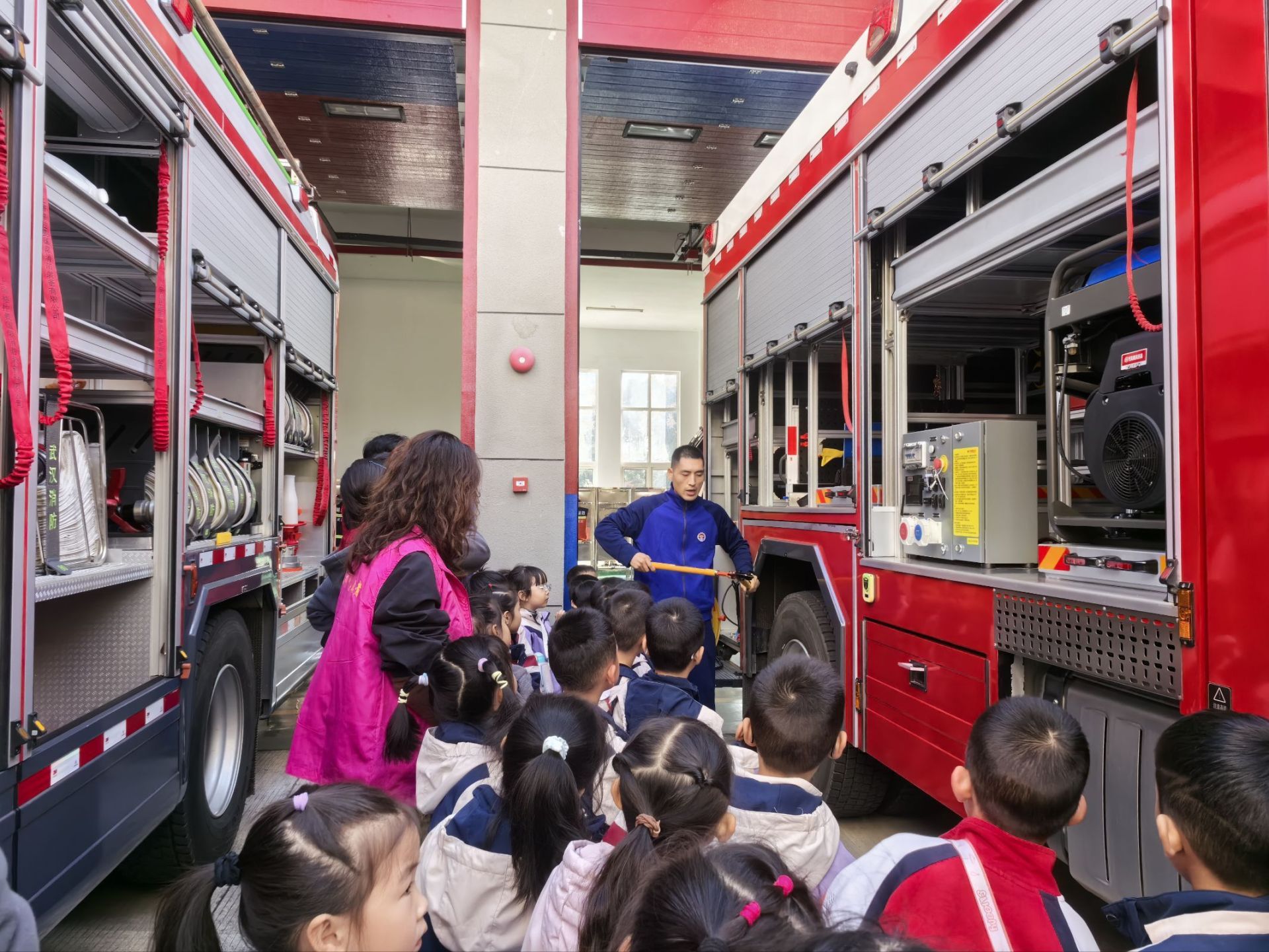 活动于上午9:30正式开始。在消防员和教师的共同组织下,孩子们有序进入消防站,首先参观各类消防车辆。消防员细致讲解云梯车、水罐车、抢险救援车等不同车辆的功能特点,并引导幼儿近距离观察随车器材,帮助孩子们初步建立对消防装备的认知。