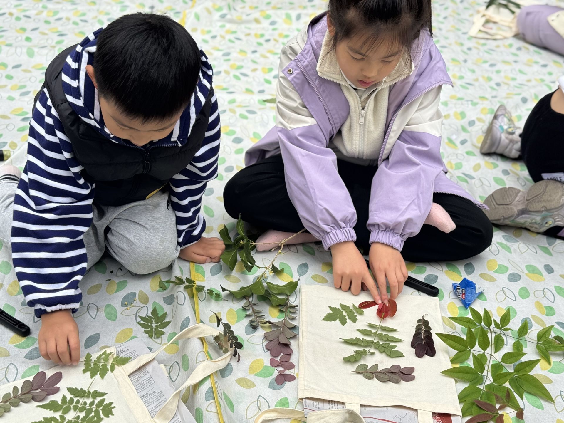 最令人期待的亲子手工DIY“树叶敲染手提袋”环节闪亮登场。活动前,不少家庭就精心准备了色彩斑斓的花草,有红得似火的枫叶,宛如燃烧的火焰;金得发亮的桂花,散发着迷人的芬芳;绿得清脆的三叶草,充满了生机与活力。