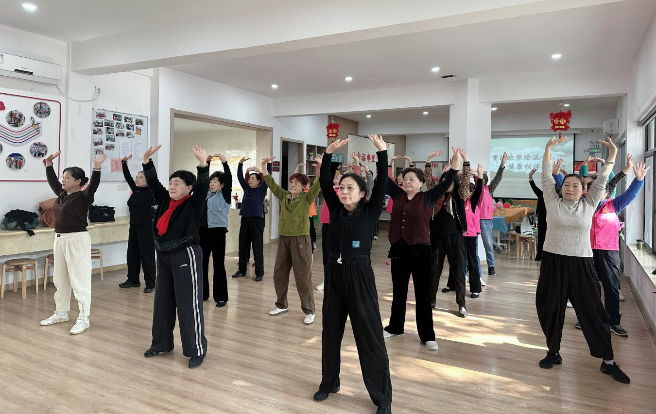 游戏过后,活动节奏渐趋舒缓。在悠扬的音乐中,佰穗养老服务中心的陈老师带领大家练习太极八段锦。她身着素雅太极服,动作流畅舒展,从“两手托天理三焦”到“左右开弓似射雕”,耐心讲解每一式的动作要领与养生功效。老人们纷纷跟随练习,举手投足间气息均匀,在一招一式中感受传统养生文化的魅力。