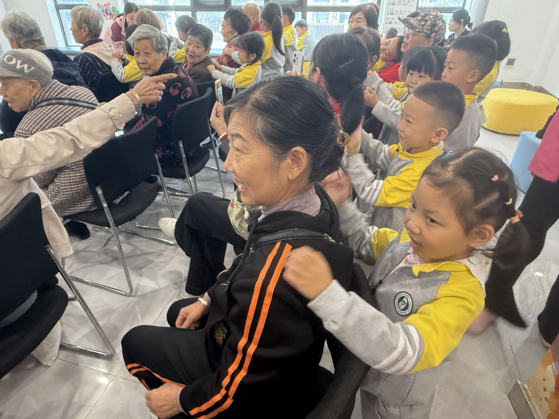 最让人动容的当属“温情陪伴”环节。在老师的引导下,小朋友们一对一走到老人身边,踮起脚尖为爷爷奶奶捶捶肩、捏捏腿。“奶奶,力度够吗?”“爷爷,这里酸不酸?”孩子们的贴心询问让老人们心里暖暖的,现场没有华丽的辞藻,只有小手与大手的触碰,以及此起彼伏的笑声,构成一幅温馨的“孝亲图”。