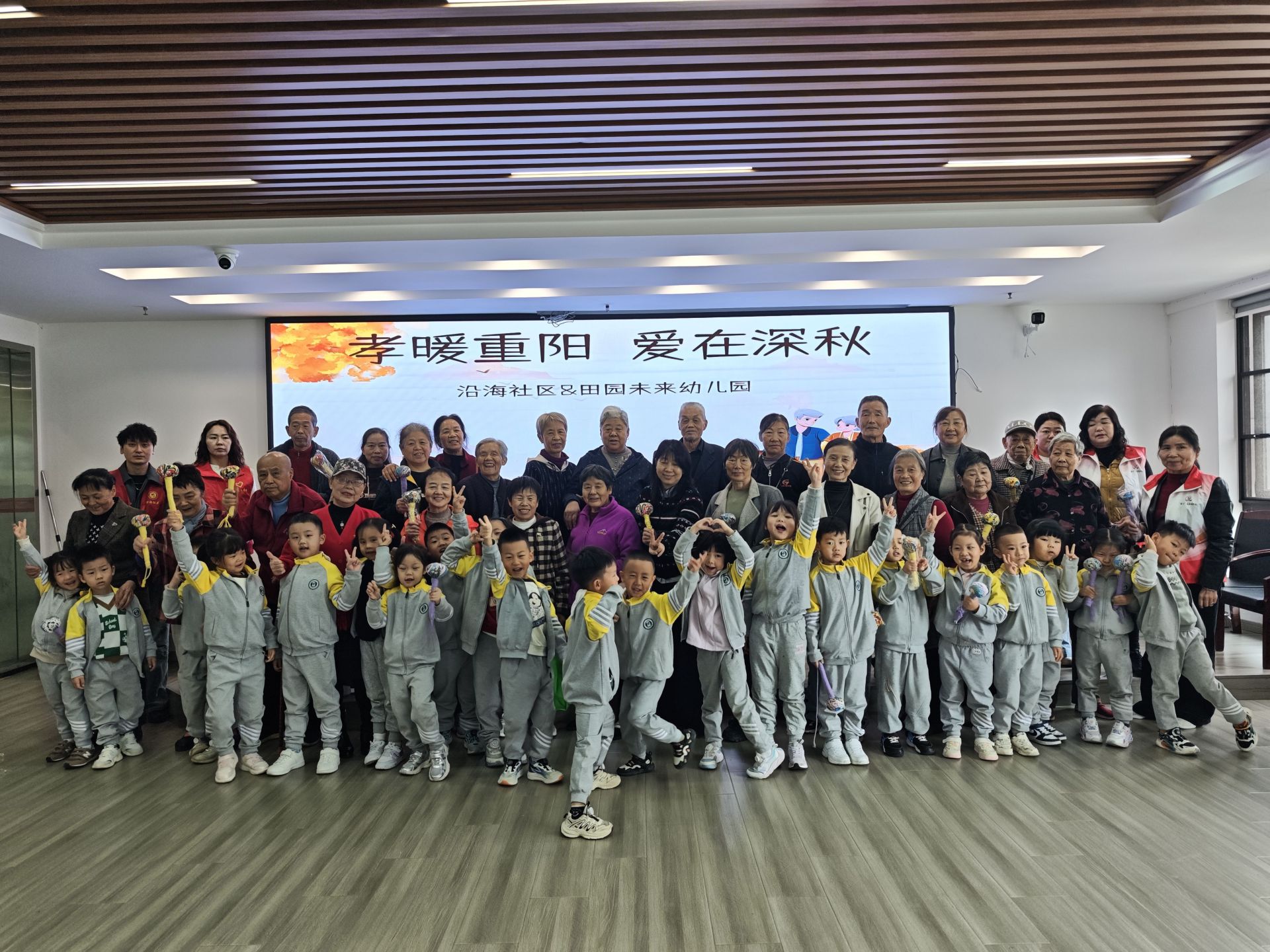 岁岁重阳,今又重阳。为传承中华民族“孝老爱亲”的传统美德,10月29日上午,沿海社区联合田园未来幼儿园共同开展“孝暖重阳 爱在深秋”主题活动,让社区老人们在欢声笑语中感受秋日温情,也让孩子们在实践中领悟孝道的真谛。