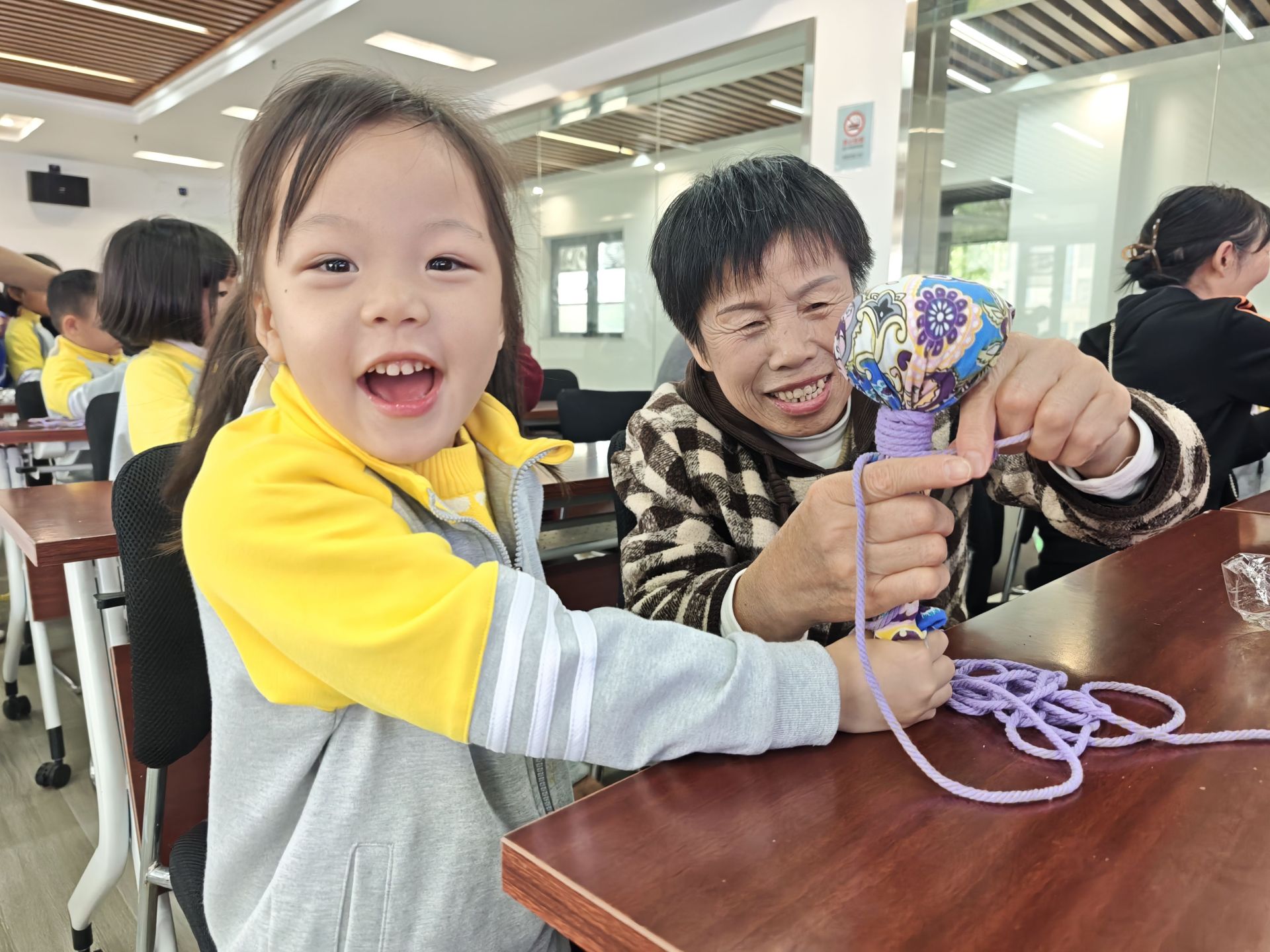 活动最后,大家一起动手制作艾草锤。小朋友们在老人的指导下,小心翼翼地将艾草装进布袋,再和老人一起用彩线缠绕固定。有的孩子手法生疏,老人们便耐心示范;有的老人眼神不好,孩子们就帮忙缠线。不一会儿,一个个散发着淡淡艾草香的艾草锤就完成了,老人们握着亲手制作的艾草锤,脸上满是欣慰,孩子们也举着自己的“成果”开心炫耀,现场满是艾草的清香与幸福的味道。