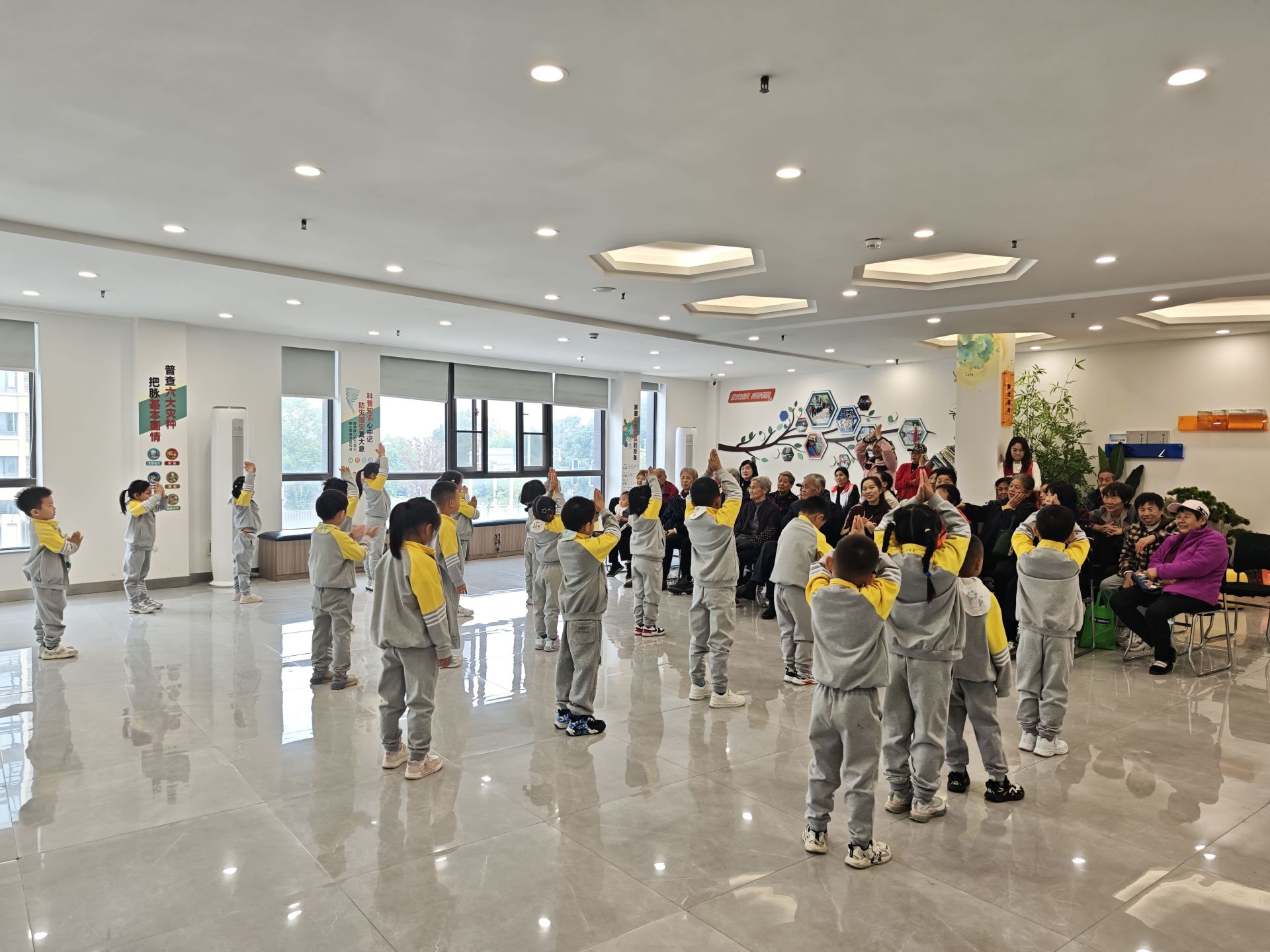 活动现场,随着轻快的音乐响起,田园未来幼儿园的小朋友们身着整齐服装,排好队形,为在场老人们带来舞蹈《中国孝道》。孩子们动作稚嫩却认真,抬手、转身、屈膝间满是童真,每一个眼神都传递着对老人的敬意,台下老人们纷纷拿出手机记录,不时响起阵阵掌声,笑容在皱纹间绽放。随后进入“重阳故事会”环节,小朋友们用奶声奶气的声音讲述重阳节的由来,老人们听得格外专注,偶尔还会轻轻点头。