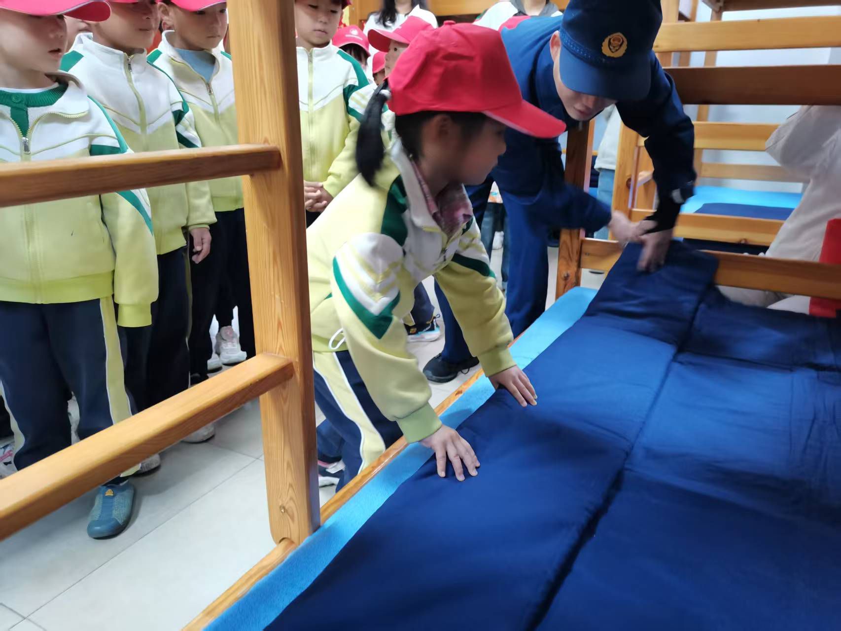 消防员现场演示叠被步骤:平铺、压实、测量折痕、精细修整,每一个动作都透着严谨与专注。孩子们迫不及待地模仿起来,虽然叠出的被子略显稚嫩,但专注的神情中满是对纪律的敬畏。