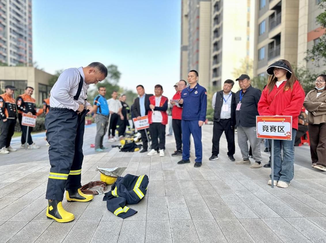 比赛设置原地穿着全套灭火防护装备、干粉灭火器灭油盆火、两盘水带连接消防栓出水等三项实战科目,全方位检验参赛队伍的应急处置能力。赛场上,参赛队员防护装备穿戴一气呵成,灭火器“提拔握压”精准灭火,水带连接快速流畅、出水命中靶心,赢得现场居民阵阵掌声。裁判组由街平安建设办、派出所及社区安全专干组成,依据“穿戴规范性、操作准确性、完成速度”三大维度打分,2名居民代表全程监督,确保公平公正。
