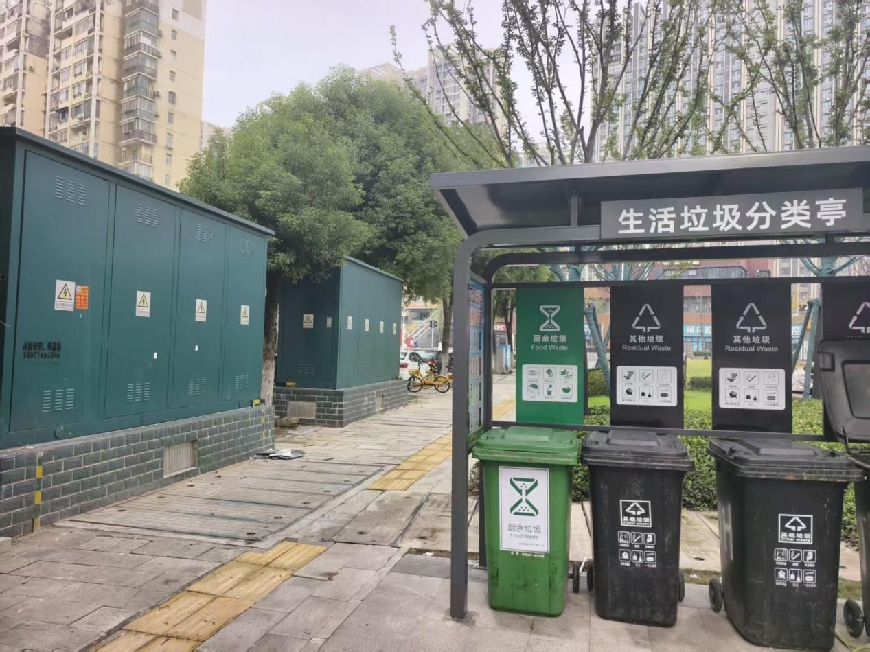 据了解,针对两条商业街的不同业态与场地条件,环卫部门采取了“一地一策”的分类设施布局方案。保利锦上印商业街地域开阔且绿化带分布较广,便于集中设置分类点位,因此专门搭建了4座垃圾分类亭,为商户和居民提供固定、规范的投放空间;美联奥公馆商业街因场地狭窄,不便建设大型亭体,则因地制宜配置了4组垃圾分类桶,实现空间利用与分类需求的精准匹配。